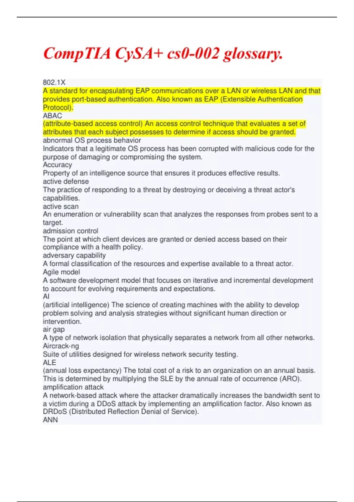 A formal classification of the resources and expertise available to a threat actor. Agile model A software development model that focuses on iterative and incremental development to account for evolving requirements and expectations. AI (artificial intelligence) The science of creating machines with the ability to develop problem solving and analysis strategies without significant human direction or intervention. air gap A type of network isolation that physically separates a network from all other networks. Aircrack-ng Suite of utilities designed for wireless network security testing. ALE (annual loss expectancy) The total cost of a risk to an organization on an annual basis. This is determined by multiplying the SLE by the annual rate of occurrence (ARO). amplification attack A network-based attack where the attacker dramatically increases the bandwidth sent to a victim during a DDoS attack by implementing an amplification factor. Also known as DRDoS (Distributed Reflection Denial of Service). ANN