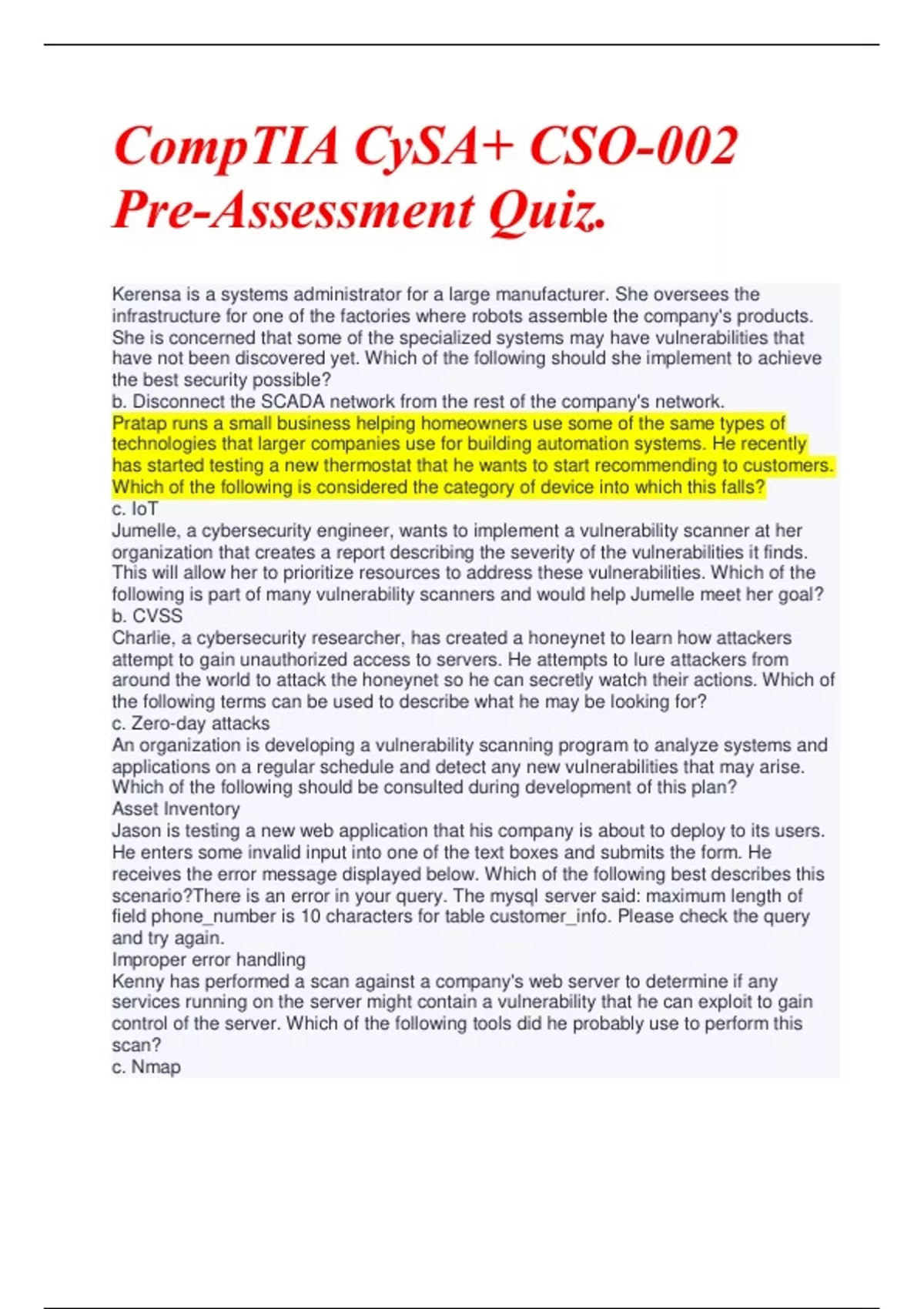 Jumelle, a cybersecurity engineer, wants to implement a vulnerability scanner at her organization that creates a report describing the severity of the vulnerabilities it finds. This will allow her to prioritize resources to address these vulnerabilities. Which of the following is part of many vulnerability scanners and would help Jumelle meet her goal? b. CVSS Charlie, a cybersecurity researcher, has created a honeynet to learn how attackers attempt to gain unauthorized access to servers. He attempts to lure attackers from around the world to attack the honeynet so he can secretly watch their actions. Which of the following terms can be used to describe what he may be looking for? c. Zero-day attacks An organization is developing a vulnerability scanning program to analyze systems and applications on a regular schedule and detect any new vulnerabilities that may arise. Which of the following should be consulted during development of this plan? Asset Inventory