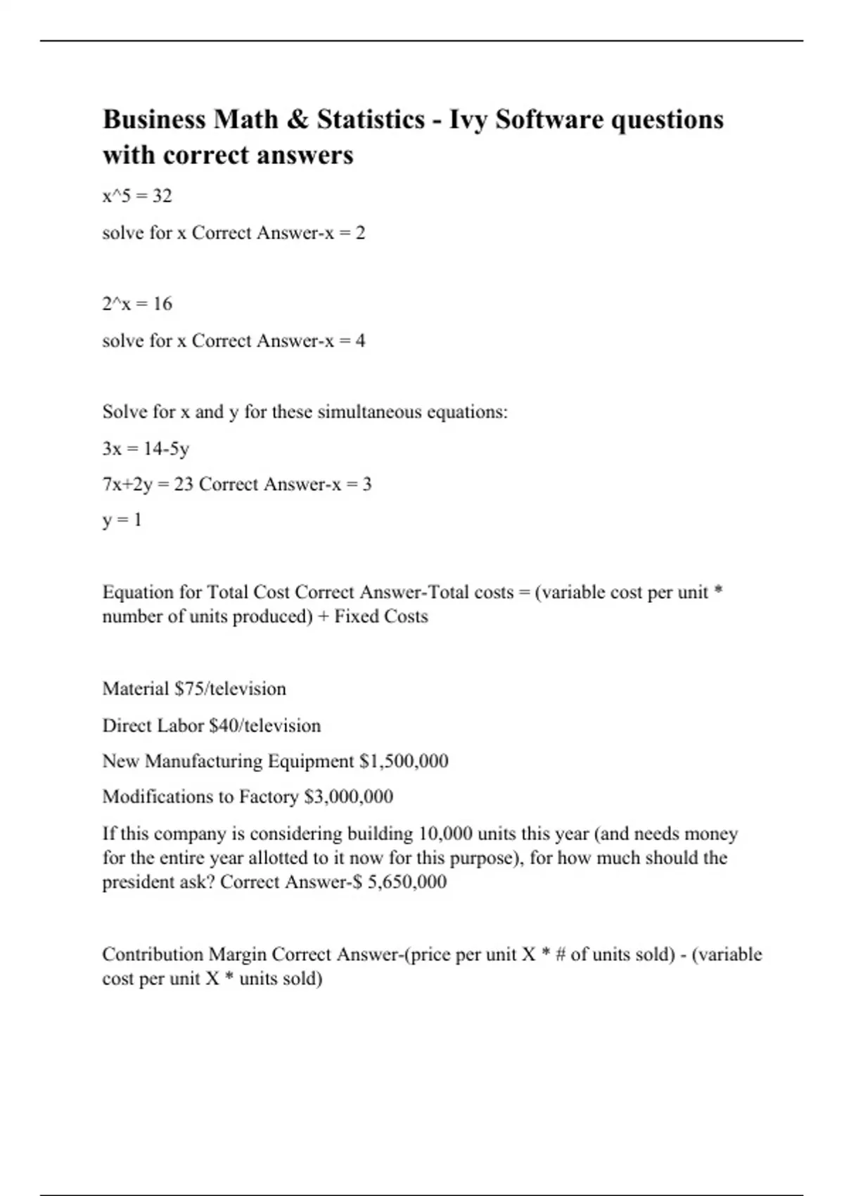 Business Math & Statistics - Ivy Software Questions With Complete Solutions