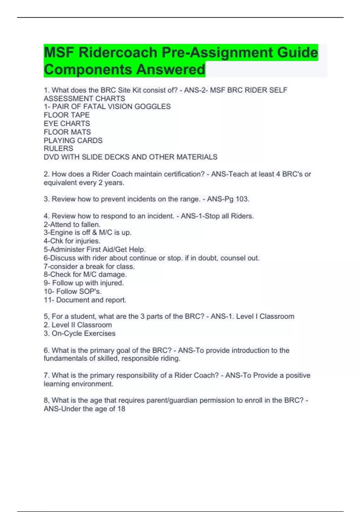 MSF Ridercoach Pre-Assignment Guide Components Answered