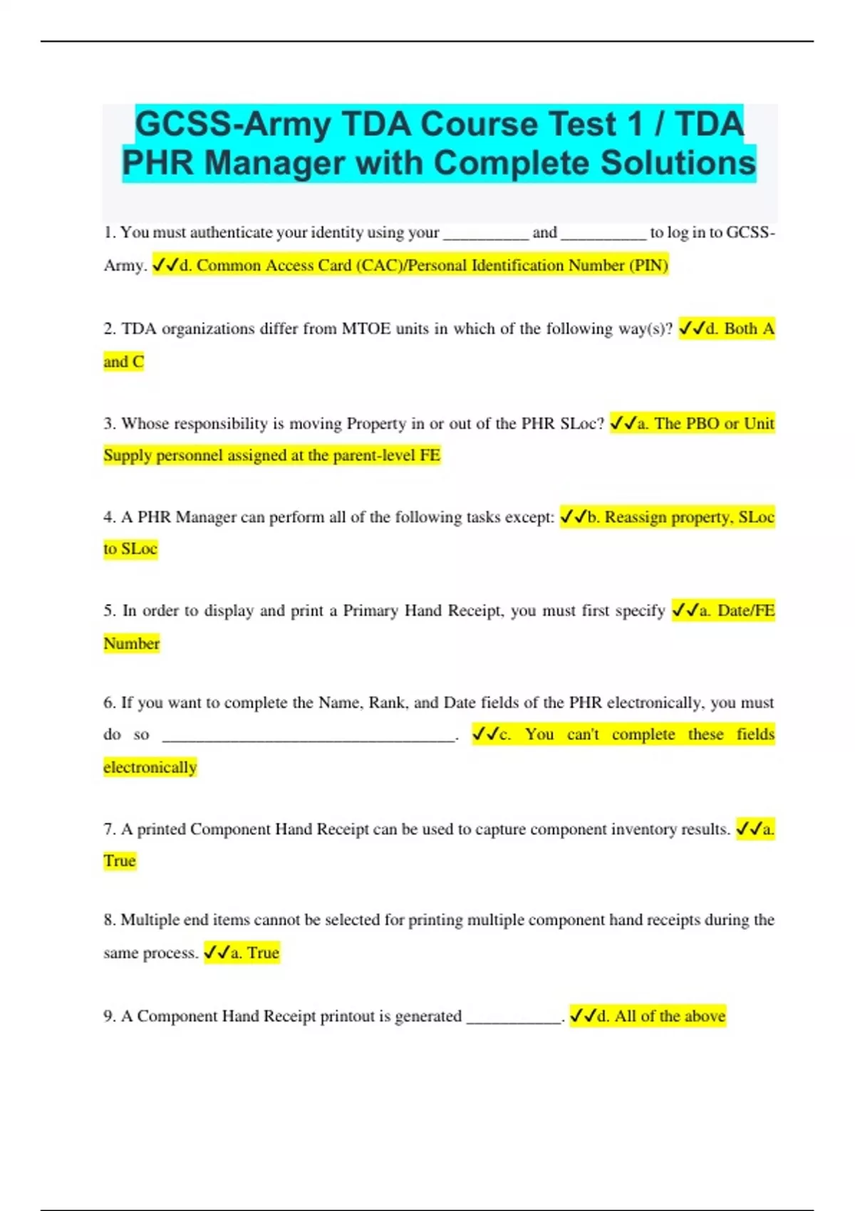 GCSS-Army TDA Course Test 1 / TDA PHR Manager with Complete Solutions