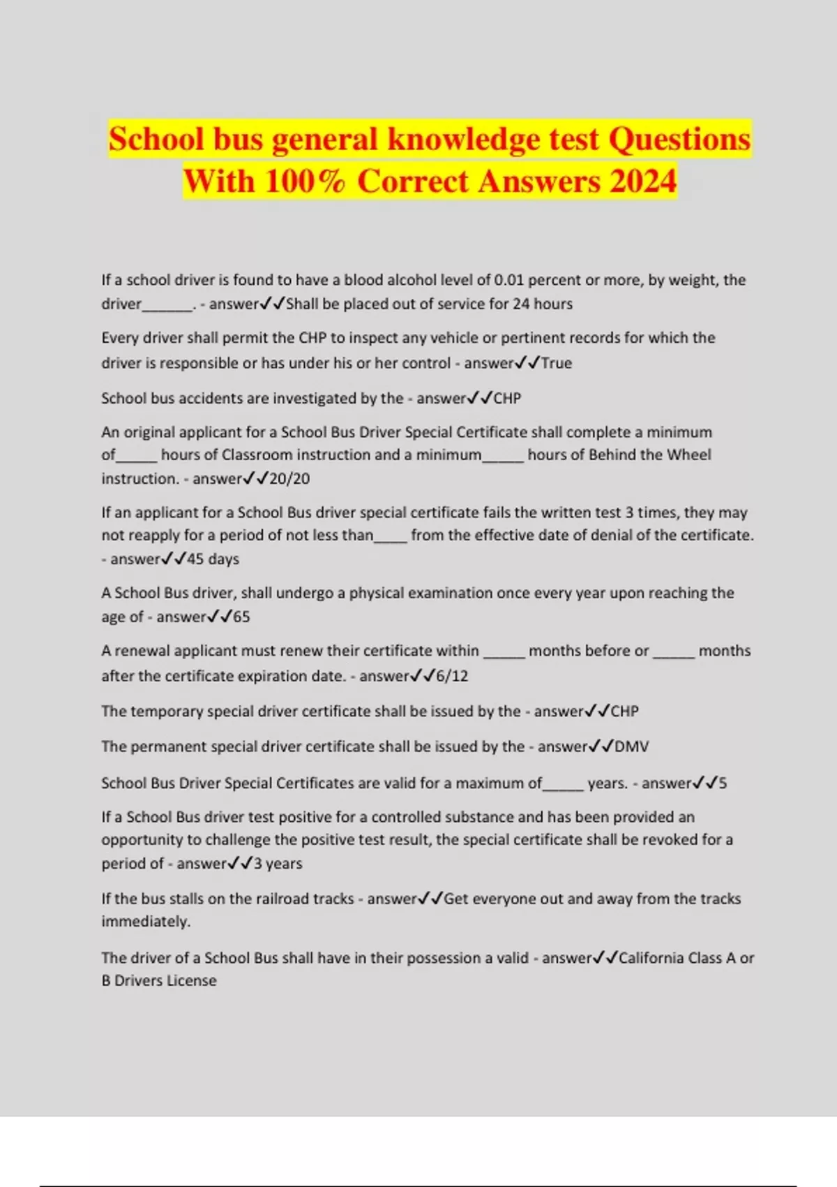 School bus general knowledge test Questions With 100% Correct Answers 2024