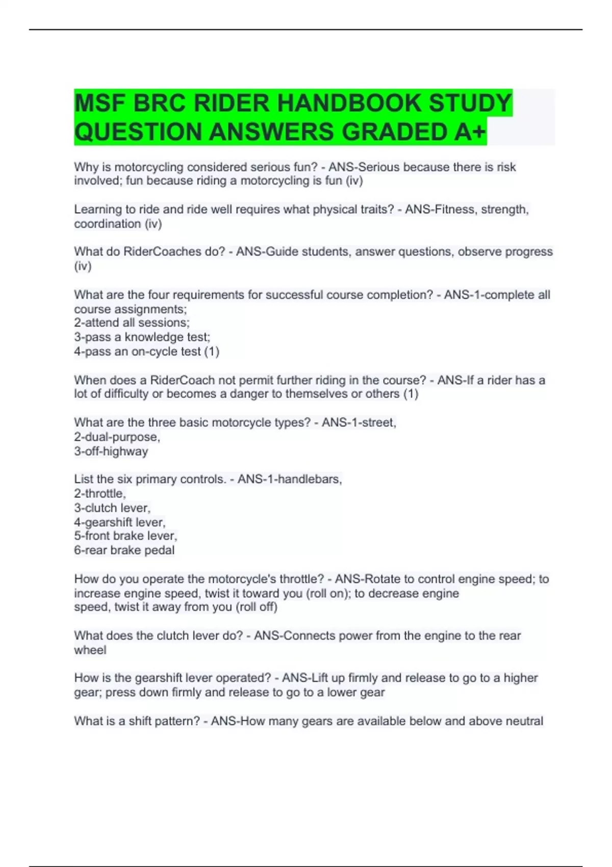 MSF BRC RIDER HANDBOOK STUDY QUESTION ANSWERS GRADED A+