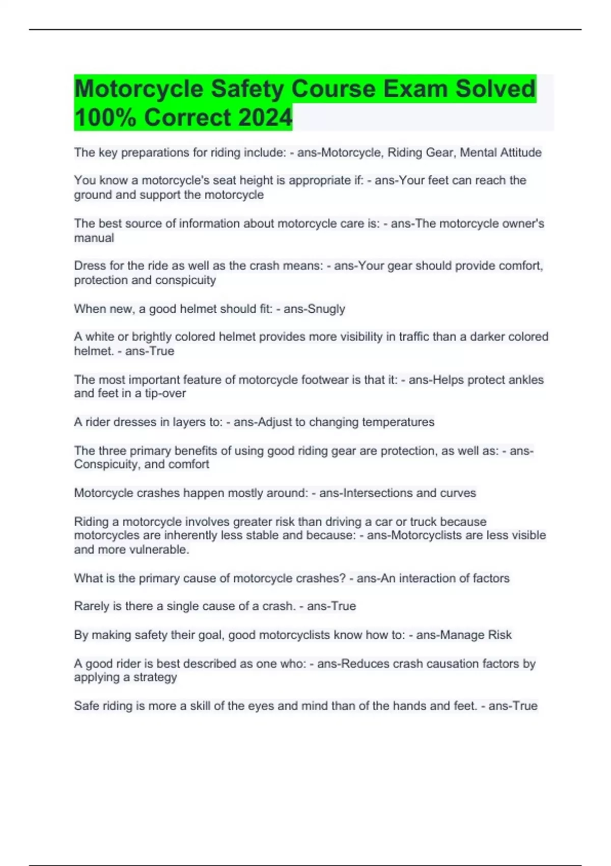 Motorcycle Safety Course Exam Solved 100% Correct 2024