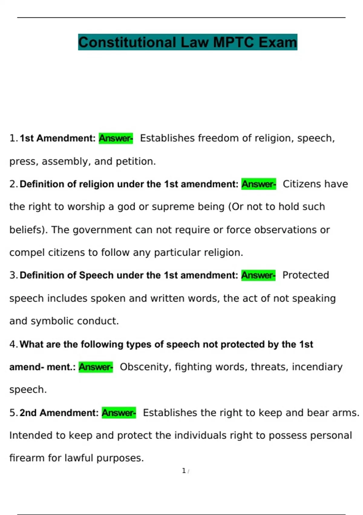 Constitutional Law MPTC Exam 1st Amendment - answerEstablishes freedom of religion,speech,press,assembly, and petition. Definition of religion under the 1st amendment - answerCitizens have the right to worship a god or supreme being (Or not to hold such beliefs). The government can not require or force observations or compel citizens to follow any particular religion. Definition of Speech under the 1st amendment - answerProtected speech includes spoken and written words, the act of not speaking and symbolic conduct. What are the following types of speech not protected by the 1st amendment. - answerObscenity, fighting words, threats, incendiary speech. 2nd Amendment - answerEstablishes the right to keep and bear arms. Intended to keep and protect the individuals right to possess personal firearm for lawful purposes. 4th Amendment - answerProhibits unreasonable searches and seizures by the government. Definition of a Search - answerPhysical invasion or intrusion of privacy by police on people, homes or personal property to obtain info or gather evidence. Definition of a seizure - answerWhen police take possession of property, make an arrest, or restrict a persons ability to move freely. 5th Amendment - answerProhibits citizens from being punished for the same offense twice (Double Jeopardy) from being compelled to testify against themselves (Self-Incrimination) provides the right to indictment for certain types of offenses by a grand jury and guarantees due process of law. 6th Amendment - answerRequires all persons charged with a crime be informed of charges against them. People charged with a crime have a right to council and right to a speedy trial by impartial jury. 8th Amendment - answerProtects people from excessive bail and fines and prohibits cruel and unusual punishment. 14th Amendment - answerProvided the people of all states the right to
