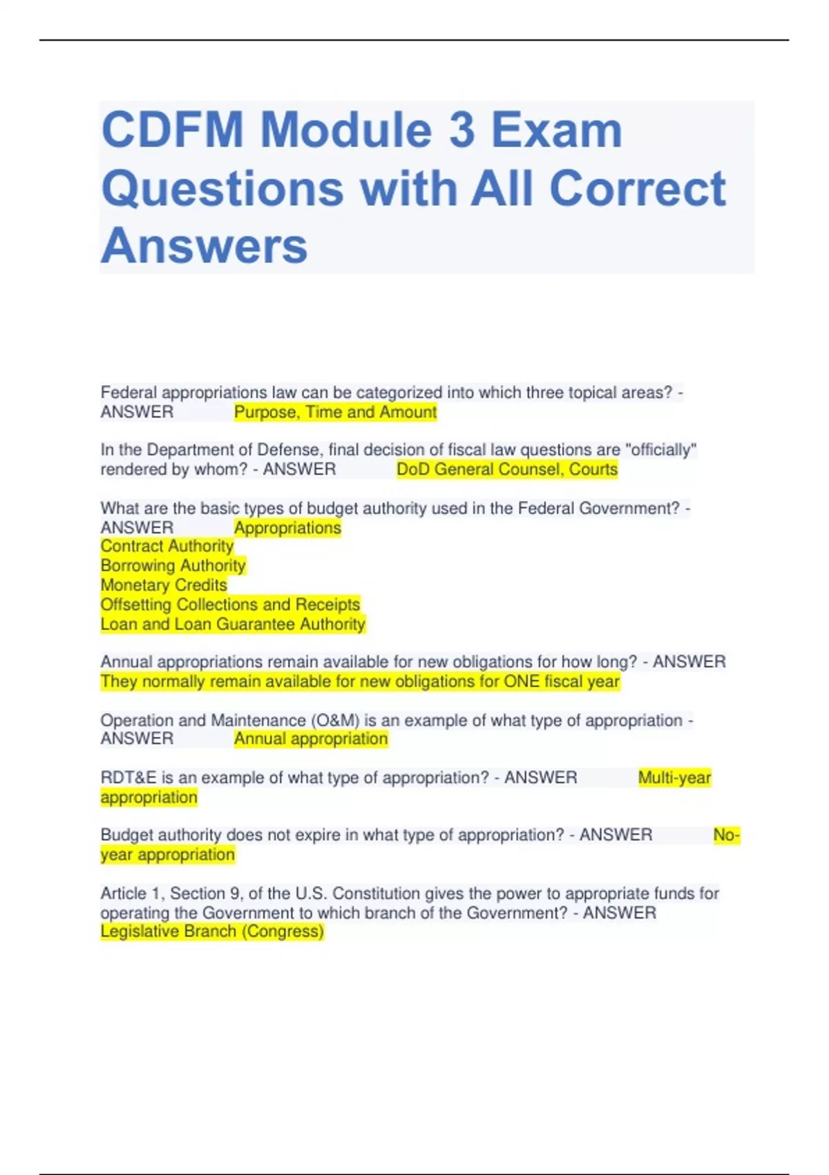 CDFM Module 3 Exam Questions with All Correct Answers Federal appropriations law can be categorized into which three topical areas? - ANSWER Purpose, Time and Amount In the Department of Defense, final decision of fiscal law questions are "officially" rendered by whom? - ANSWER DoD General Counsel, Courts What are the basic types of budget authority used in the Federal Government? - ANSWER Appropriations Contract Authority Borrowing Authority Monetary Credits Offsetting Collections and Receipts Loan and Loan Guarantee Authority Annual appropriations remain available for new obligations for how long? - ANSWER They normally remain available for new obligations for ONE fiscal year Operation and Maintenance (O&M) is an example of what type of appropriation - ANSWER Annual appropriation RDT&E is an example of what type of appropriation? - ANSWER Multi-year appropriation Budget authority does not expire in what type of appropriation? - ANSWER Noyear appropriation Article 1, Section 9, of the U.S. Constitution gives the power to appropriate funds for operating the Government to which branch of the Government? - ANSWER Legislative Branch (Congress) Which law established the House and the Senate Budget Committees and the Congressional Budget Office (CBO)? - ANSWER Congressional Budget Act of 1974 What are the three tests that must be met for use of Necessary Expense doctrine? - ANSWER Must bear a logical relationship, not prohibited by law, not funded elsewhere Who are determined to be accountable individuals in the DoD? - ANSWER Certifying and Disbursing Officers and Departmental Accountable Officials Who grants relief of liability to a certifying officer for erroneous or illegal payments in the Department of Defense? - ANSWER DFAS What type of budgetary resources remain available for new obligations for more than one fiscal year? - ANSWER Multi-year authority What type of budgetary resources remains available for new obligations until the purpose for which they were provided is carried out? - ANSWER No-year authority What type of Congressional resolution can be thought of as a temporary appropriations act? - ANSWER Continuing resolution If a Contracting Officers signs a contract in advance of an appropriation, what type of violation ahs occurred? - ANSWER Anti Deficiency Act Violation What agency apportions funds for working capital fund? - ANSWER OMB What are the four major functions in DoD Finance? - ANSWER Entitlements, Payments, Collections, Control of Public Funds What is the primary organization in DoD with the responsibility for Finance requirements? - ANSWER DFAS What is the acronym for disbursing office identification number? - ANSWER DSSN What three primary types of officials are accountable Individuals in the DoD? - ANSWER Certifying Officers, Disbursing Officers, Departmental Accountable Officials Debt collection incudes collection of debts from what three groups? - ANSWER Current Employees and Military Members, Former Employees and Military Members, Vendors