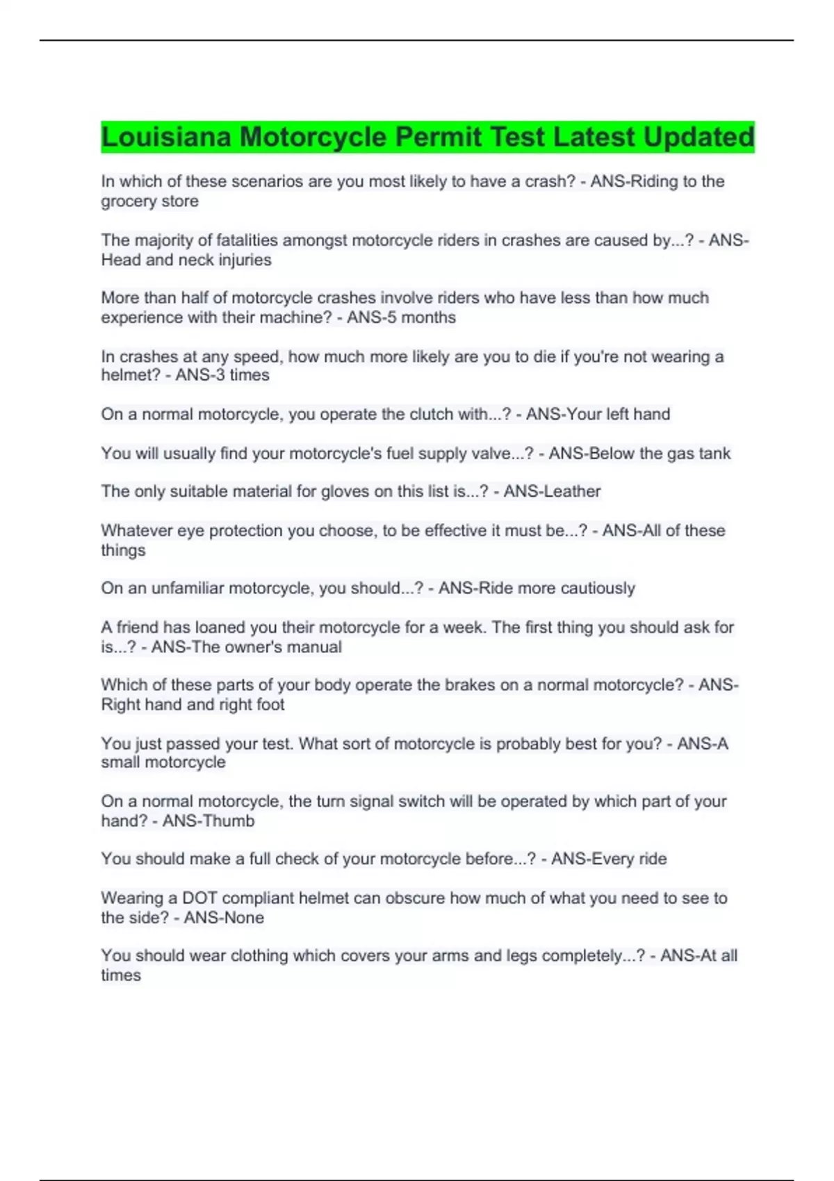 Louisiana Motorcycle Permit Test Latest Updated.