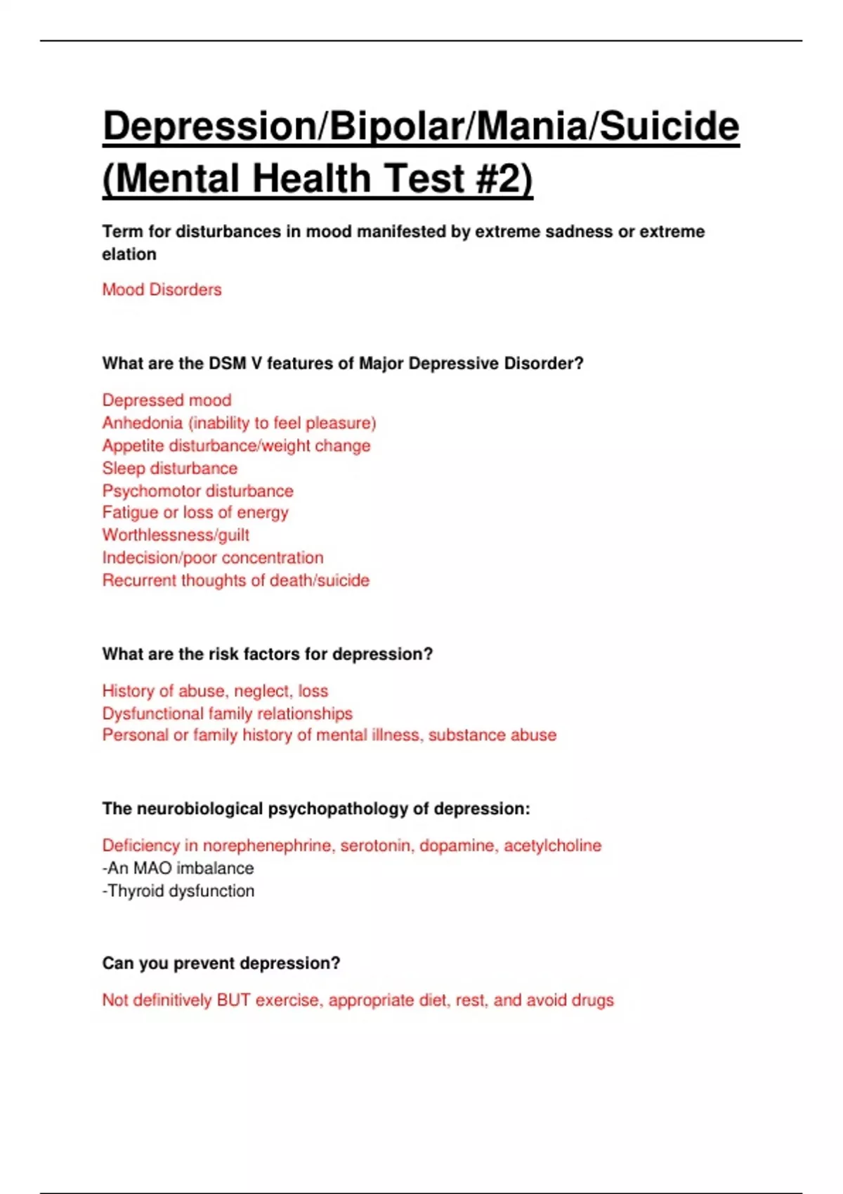 Depression/Bipolar/Mania/Suicide MENTAL HEALTH TEST 2. QUESTIONS AND ANSWERS.