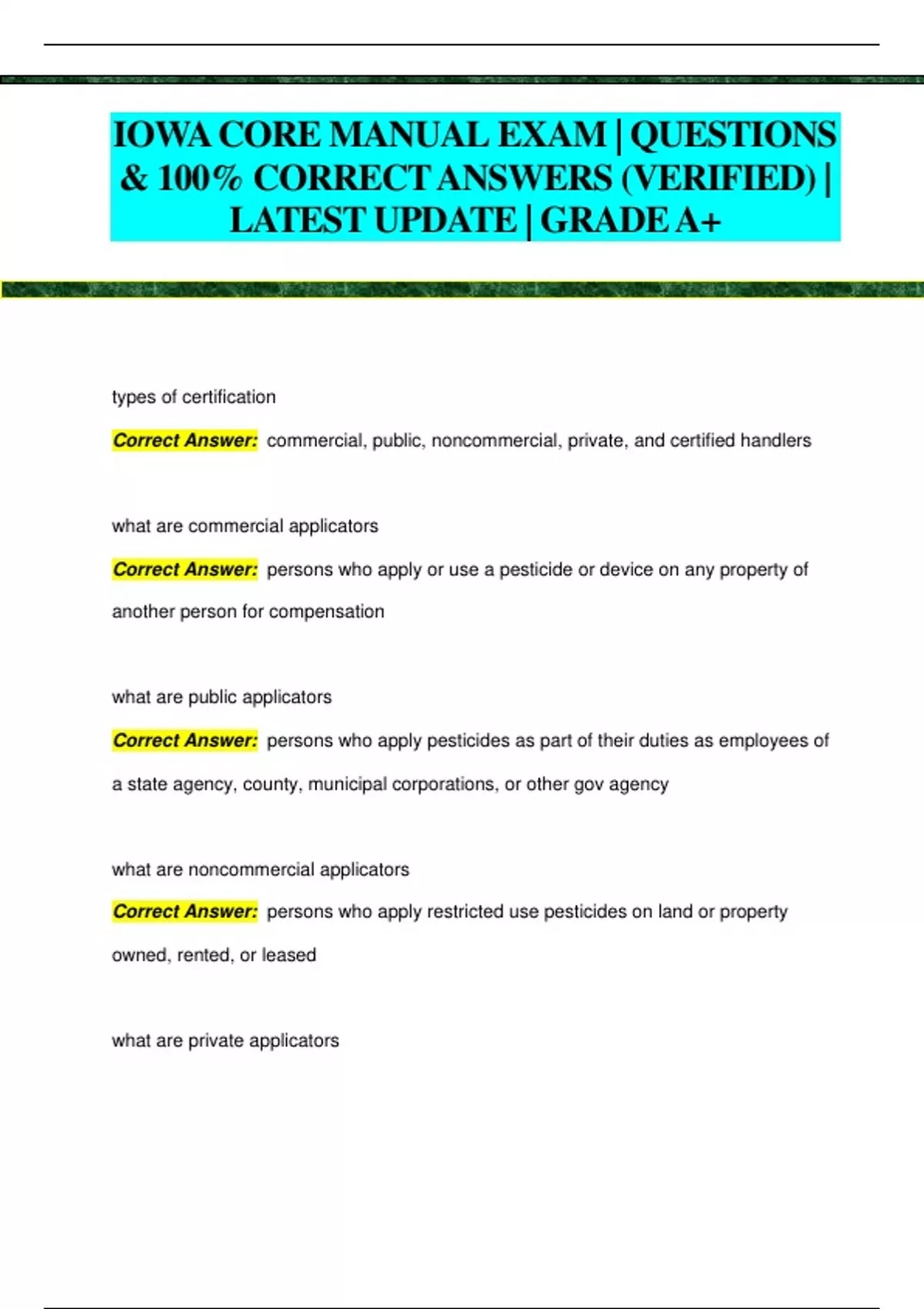 IOWA CORE MANUAL EXAM | QUESTIONS & 100% CORRECT ANSWERS (VERIFIED) | LATEST UPDATE | GRADEA+ types of certification Correct Answer: commercial, public, noncommercial, private, and certified handlers what are commercial applicators Correct Answer: persons who apply or use a pesticide or device on any property of another person for compensation what are public applicators Correct Answer: persons who apply pesticides as part of their duties as employees of a state agency, county, municipal corporations, or other gov agency what are noncommercial applicators Correct Answer: persons who apply restricted use pesticides on land or property owned, rented, or leased what are private applicators Correct Answer: persons who apply any restricted use pesticide for the production of an ag commodity on property owned or rented by themselves or their employers what are certified handlers Correct Answer: persons employed by a licensed commercial applicators who handle pesticides in other than unopened containers for the purpose of preparing, mixing, or loading pesticides for application by another person T or F: a pesticide license is not valid without a certified applicator Correct Answer: true what are the lengths of certifications Correct Answer: one and three year if you apply pesticides for a licensed company, what is required of you? Correct Answer: be certified and must be listed as an applicator under a current iowa pesticide applicator license what happens after passing the exam Correct Answer: you enter a three year qualification cycle how can you renew your certificatio