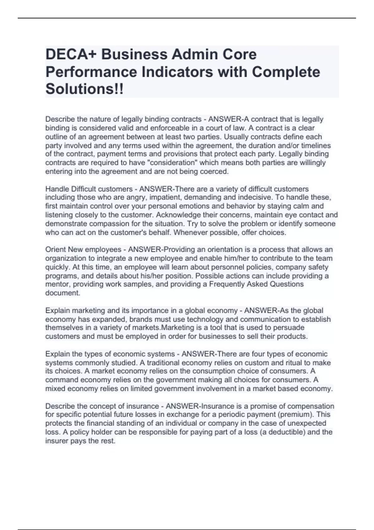 Describe the nature of legally binding contracts - ANSWER-A contract that is legally binding is considered valid and enforceable in a court of law. A contract is a clear outline of an agreement between at least two parties. Usually contracts define each party involved and any terms used within the agreement, the duration and/or timelines of the contract, payment terms and provisions that protect each party. Legally binding contracts are required to have "consideration" which means both parties are willingly entering into the agreement and are not being coerced. Handle Difficult customers - ANSWER-There are a variety of difficult customers including those who are angry, impatient, demanding and indecisive. To handle these, first maintain control over your personal emotions and behavior by staying calm and listening closely to the customer. Acknowledge their concerns, maintain eye contact and demonstrate compassion for the situation. Try to solve the problem or identify someone who can act on the customer's behalf. Whenever possible, offer choices. Orient New employees - ANSWER-Providing an orientation is a process that allows an organization to integrate a new employee and enable him/her to contribute to the team quickly. At this time, an employee will learn about personnel policies, company safety programs, and details about his/her position. Possible actions can include providing a mentor, providing work samples, and providing a Frequently Asked Questions document. Explain marketing and its importance in a global economy - ANSWER-As the global economy has expanded, brands must use technology and communication to establish themselves in a variety of markets.Marketing is a tool that is used to persuade customers and must be employed in order for businesses to sell their products. Explain the types of economic systems - ANSWER-There are four types of economic systems commonly studied. A traditional economy relies on custom and ritual to make its choices. A market economy relies on the consumption choice of consumers. A command economy relies on the government making all choices for consumers. A mixed economy relies on limited government involvement in a market based economy. Describe the concept of insurance - ANSWER-Insurance is a promise of compensation for specific potential future losses in exchange for a periodic payment (premium). This protects the financial standing of an individual or company in the case of unexpected loss. A policy holder can be responsible for paying part of a loss (a deductible) and the insurer pays the rest. Discuss the nature of customer management - ANSWER-The goal of customer relationship management (CRM) is to maximize the value and effectiveness of all opportunities that businesses have to connect with customers; provide outstanding service to customers; maximize customer satisfaction; attract and retain loyal customers; cultivate and maintain positive, profitable relationships with customers and develop individualized relationships with customers. Discuss actions employees