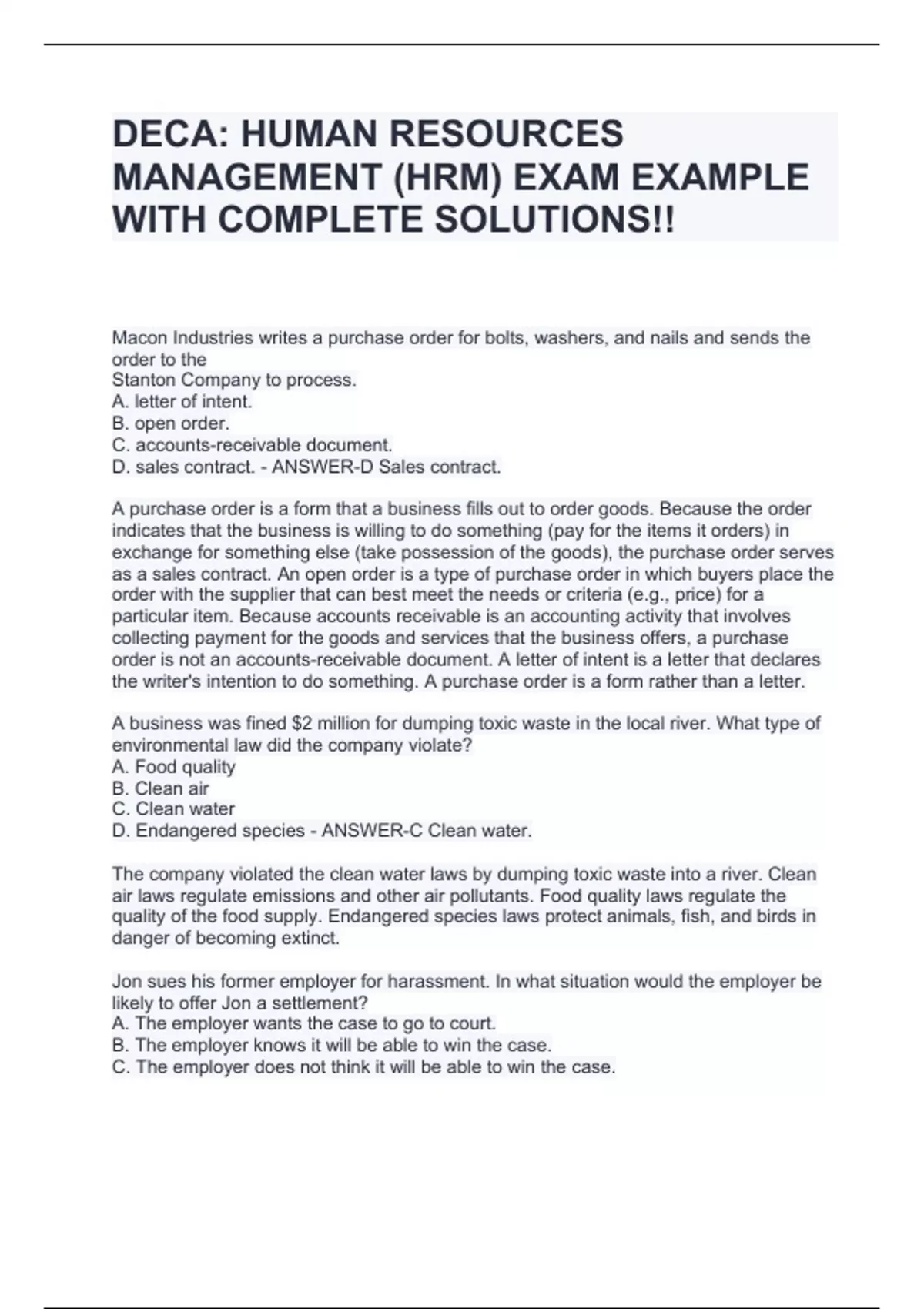 Macon Industries writes a purchase order for bolts, washers, and nails and sends the order to the Stanton Company to process. A. letter of intent. B. open order. C. accounts-receivable document. D. sales contract. - ANSWER-D Sales contract. A purchase order is a form that a business fills out to order goods. Because the order indicates that the business is willing to do something (pay for the items it orders) in exchange for something else (take possession of the goods), the purchase order serves as a sales contract. An open order is a type of purchase order in which buyers place the order with the supplier that can best meet the needs or criteria (e.g., price) for a particular item. Because accounts receivable is an accounting activity that involves collecting payment for the goods and services that the business offers, a purchase order is not an accounts-receivable document. A letter of intent is a letter that declares the writer's intention to do something. A purchase order is a form rather than a letter. A business was fined $2 million for dumping toxic waste in the local river. What type of environmental law did the company violate? A. Food quality B. Clean air C. Clean water D. Endangered species - ANSWER-C Clean water. The company violated the clean water laws by dumping toxic waste into a river. Clean air laws regulate emissions and other air pollutants. Food quality laws regulate the quality of the food supply. Endangered species laws protect animals, fish, and birds in danger of becoming extinct. Jon sues his former employer for harassment. In what situation would the employer be likely to offer Jon a settlement? A. The employer wants the case to go to court. B. The employer knows it will be able to win the case. C. The employer does not think it will be able to win the case. D. Jon does not think he will be able to win the case. - ANSWER-C The employer does not think it will be able to win the case. A party may offer a settlement if it believes it has little chance to win a case. In this example, Jon's employer does not believe it will win, so it may offer a settlement. A settlement is a way to avoid the case going to court. Jon may or may not think he will win the case, but this does not influence his former employer's actions. Which of the following words most accurately describes arbitration: A. Private B. Nonconsensual C. Biased D. Temporary - ANSWER-A. Private. Arbitration is private and not public or handled in the courts. Arbitration is consensual. Both parties must sign an agreement assenting to arbitration. Arbitration is neutral, not biased. Arbitration is final and binding, not temporary. To be reimbursed for business expenses, Luke must obtain and complete an expense-reimbursement form, attach the original transaction receipts to the completed form, and submit the documentation to his manager for approval. What is Luke doing? A. Following company procedures B. Developing company policies C. Evaluating company feedback D. Assessing company guidelines - ANSWER-A. Following company procedures. Policies are the general rules to be followed by company personnel. For example, a business owner may develop a policy that states the company will reimburse employees for certain business-related expenses. A procedure is the step-by-step process that personnel follow in performing a specific task. In the example, Luke was following certain steps to obtain reimbursement for out-of-pocket expenses that he incurred—obtaining and completing the appropriate form, attaching receipts, and submitting the documentation to his manager. In the example, Luke did not develop the policies, evaluate company feedback, or assess company guidelines. To use oral communication effectively, you need to A. pronounce your words correctly. B. impress your listeners. C. know your listeners. D. distract your listeners' attention. - ANSWER-A) Pronounce your words correctly. The correct use and pronunciation of words is essential to effective oral communication. Mispronunciation creates an unfavorable impression; it can embarrass the speaker; and it may also fail to communicate the intended message. Trying to impress listeners may create a barrier to good communication. It is not necessary to know your listeners to communicate effectively. You need to attract and hold your listeners' attention, not distract them. Which of the following is typically the primary purpose of an introduction during a presentation: A. To share a funny story B. To provide supporting details C. To summarize the talk D. To gain the audience's attention - ANSWER-D) To gain the audience's attention. Effective introductions gain the audience's attention. Supporting details are usually provided in the middle of a presentation. A speaker might outline the main points to be discussed in his/her opening remarks, but summarizing the talk would occur at the end. An effective introduction might include a funny story to gain the audience's attention, but there are many other methods that could be used to capture the audience's attention as well. What is a key to effective note-taking? A. Active listening B. Capturing details C. Creative thinking D. Using an outline - ANSWER-A) Active listening. To take meaningful notes, you must listen to what the speaker is saying. To pick up on the key points, you must actively listen. Effective note-taking does not involve capturing every detail of the presentation, nor does it involve the use of creative thinking techniques. And although it may be helpful for s