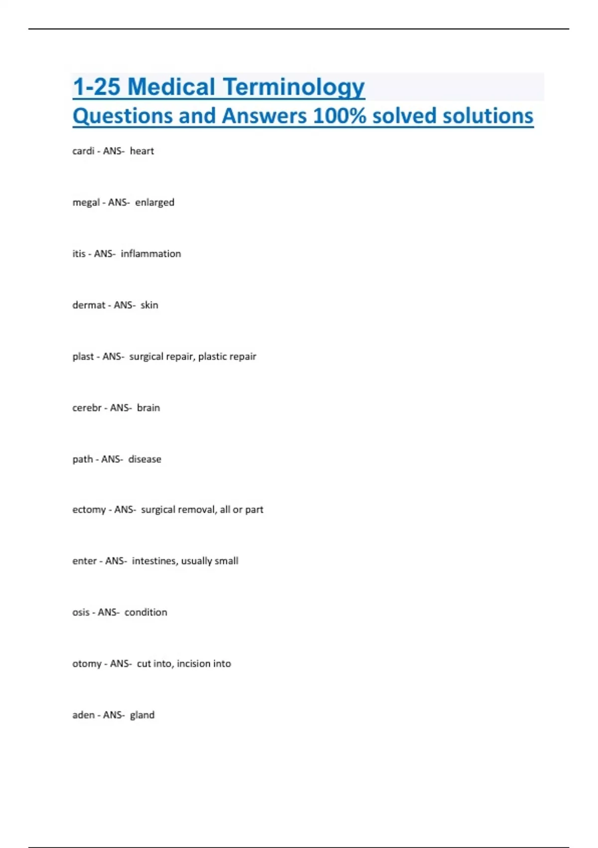 1-25 Medical Terminology Questions and Answers 100% solved solutions cardi - ANS- heart megal - ANS- enlarged itis - ANS- inflammation dermat - ANS- skin plast - ANS- surgical repair, plastic repair cerebr - ANS- brain path - ANS- disease ectomy - ANS- surgical removal, all or part enter - ANS- intestines, usually small osis - ANS- condition otomy - ANS- cut into, incision into aden - ANS- gland angi - ANS- vessel (usually blood) oma - ANS- tumor nephr - ANS- kidney hepat - ANS- liver arthr - ANS- joint blephr - ANS- eyelid ologist - ANS- specialist rhin - ANS- nose gingiv - ANS- gum malacia - ANS- soft condition ology - ANS- study of spasm - ANS- involuntary contraction algia - ANS- pain, painful condition