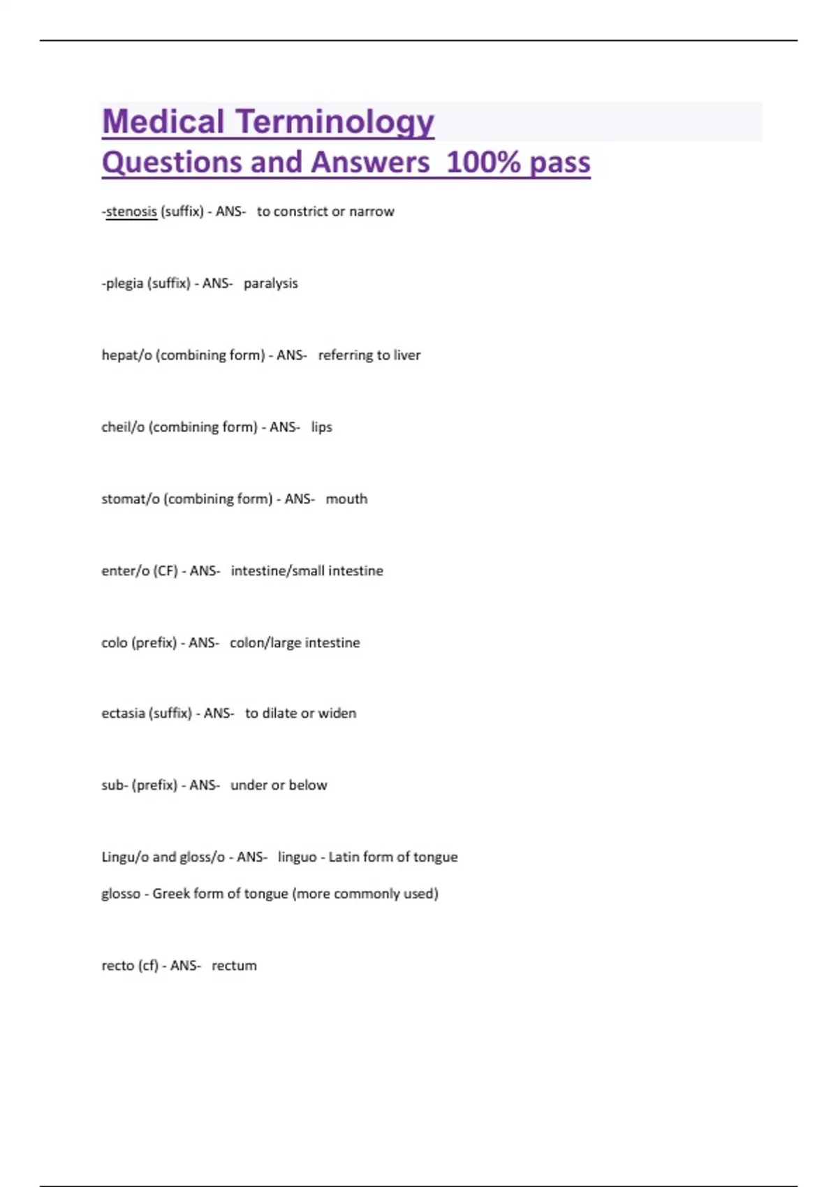 Medical Terminology Questions and Answers 100% pass -stenosis (suffix) - ANS- to constrict or narrow -plegia (suffix) - ANS- paralysis hepat/o (combining form) - ANS- referring to liver cheil/o (combining form) - ANS- lips stomat/o (combining form) - ANS- mouth enter/o (CF) - ANS- intestine/small intestine colo (prefix) - ANS- colon/large intestine ectasia (suffix) - ANS- to dilate or widen sub- (prefix) - ANS- under or below Lingu/o and gloss/o - ANS- linguo - Latin form of tongue glosso - Greek form of tongue (more commonly used) recto (cf) - ANS- rectum procto (cf) - ANS- anus and rectum (both) myco (cf) - ANS- fungus spleno (cf) - ANS- spleen pancreato (cf) - ANS- pancreas gingiva (cf) - ANS- gums atresia - ANS- tube that is closed congenital - ANS- born with -cele (suffix) - ANS- herniation -pexy (suffix) - ANS- surgical fixation of a prolapsed organ -rrhagia (suffix) - ANS- hemorrhaging/abnormal bleeding -rrhexis (suffix) - ANS- rupture -clysis (suffix) - ANS- cleanse or washing -lysis(suffix) - ANS- destruction -centesis (suffix) - ANS- surgical puncture to remove fluid chole - ANS- gall -plasty (suffix) - ANS- surgical repair gastr/o (cf) - ANS- stomach nephr/o (cf) - ANS- kidney itself (actual organ) ren/o - ANS- kidney function epi- (prefix) - ANS- above/upon stomatitis - ANS- inflammation of the mouth glossitis - ANS- inflammation of the tongue under the tongue - ANS- sublingual (Latin form) hypoglossal (Greek form - more common) glossoplasty - ANS- plastic surgery of the lips gastroenterologist - ANS- specialist that studies the diseases of the stomach and intestine enterocele - ANS- herniation of the intestine rectolysis - ANS- irrigation or washing of the rectum colostomy of colonostomy - ANS- opening into the colon gastrectasia - ANS- dilation or stretching of the stomach enteroscope - ANS- instrument that examines the intestine hepatolith - ANS- stone in the liver splenomegaly - ANS- enlargement of the spleen proctology - ANS- study of disease of anus and rectum cholecystogram - ANS- X-ray of the gallbladder cysto- - ANS- bladder or sac containing fluid -megaly (suffix) - ANS- enlargement lith/o (cf) - ANS- stone