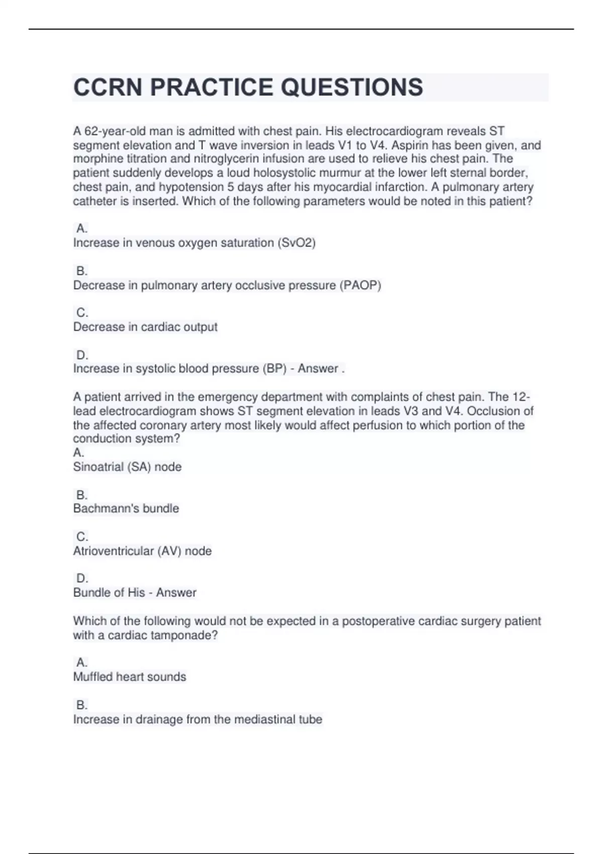 A 62-year-old man is admitted with chest pain. His electrocardiogram reveals ST segment elevation and T wave inversion in leads V1 to V4. Aspirin has been given, and morphine titration and nitroglycerin infusion are used to relieve his chest pain. The patient suddenly develops a loud holosystolic murmur at the lower left sternal border, chest pain, and hypotension 5 days after his myocardial infarction. A pulmonary artery catheter is inserted. Which of the following parameters would be noted in this patient? A. Increase in venous oxygen saturation (SvO2) B. Decrease in pulmonary artery occlusive pressure (PAOP) C. Decrease in cardiac output D. Increase in systolic blood pressure (BP) - Answer . A patient arrived in the emergency department with complaints of chest pain. The 12- lead electrocardiogram shows ST segment elevation in leads V3 and V4. Occlusion of the affected coronary artery most likely would affect perfusion to which portion of the conduction system? A. Sinoatrial (SA) node B. Bachmann's bundle C. Atrioventricular (AV) node D. Bundle of His - Answer Which of the following would not be expected in a postoperative cardiac surgery patient with a cardiac tamponade? A. Muffled heart sounds B. Increase in drainage from the mediastinal tube