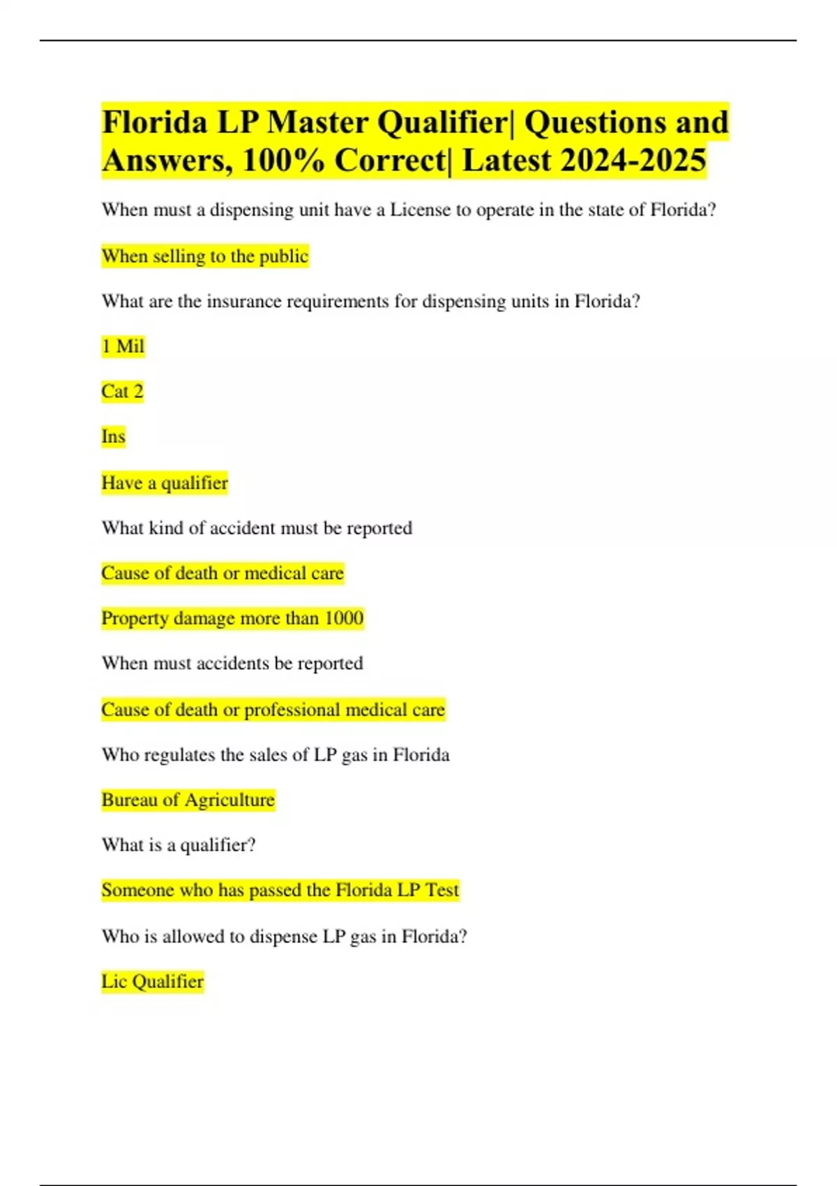 Florida LP Master Qualifier| Questions and Answers, 100% Correct| Latest When must a dispensing unit have a License to operate in the state of Florida? When selling to the public What are the insurance requirements for dispensing units in Florida? 1 Mil Cat 2 Ins Have a qualifier What kind of accident must be reported Cause of death or medical care Property damage more than 1000 When must accidents be reported Cause of death or professional medical care Who regulates the sales of LP gas in Florida Bureau of Agriculture What is a qualifier? Someone who has passed the Florida LP Test Who is allowed to dispense LP gas in Florida?