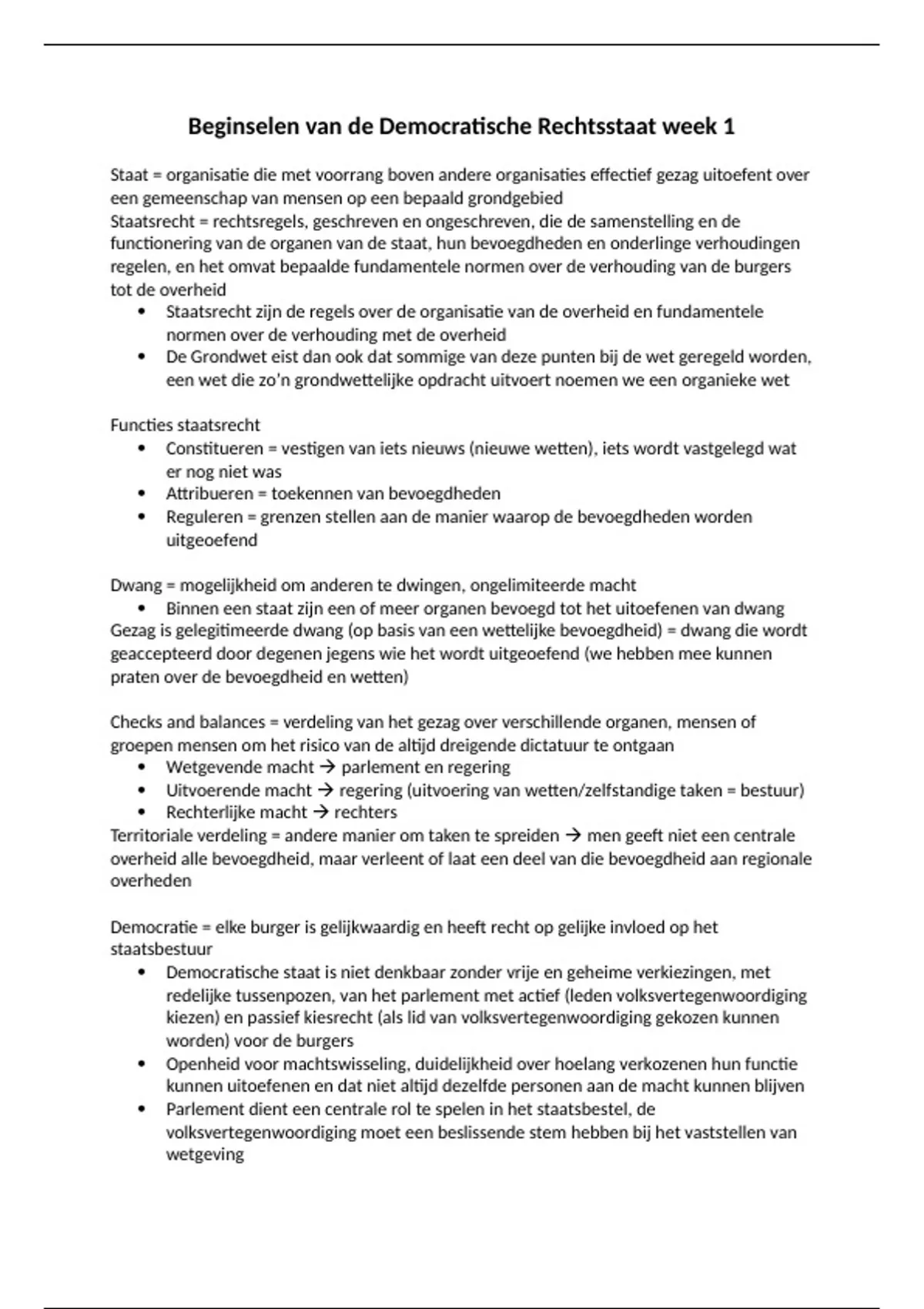 Een samenvatting van alle lesstof van het van Beginselen van de Democratische Rechtsstaat Vak: Beginselen van de Democratische Rechtsstaat Universiteit Leiden