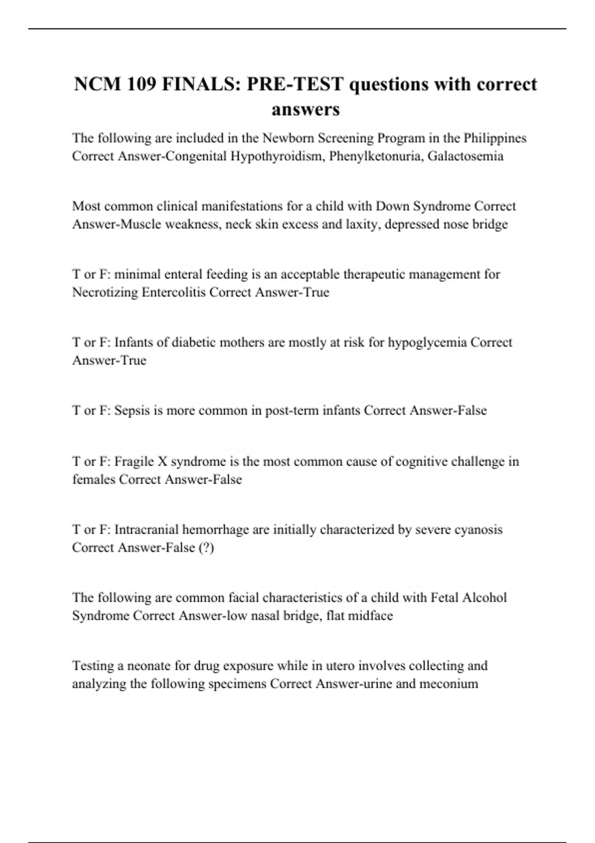 NCM 109 FINALS: PRE-TEST questions with correct answers