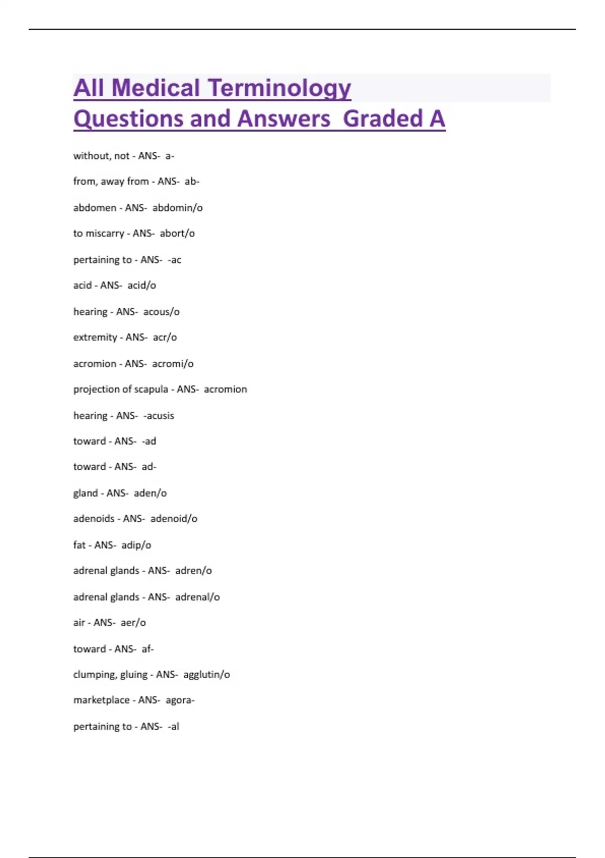 All Medical Terminology Questions and Answers Graded A without, not - ANS- afrom, away from - ANS- ababdomen - ANS- abdomin/o to miscarry - ANS- abort/o pertaining to - ANS- -ac acid - ANS- acid/o hearing - ANS- acous/o extremity - ANS- acr/o acromion - ANS- acromi/o projection of scapula - ANS- acromion hearing - ANS- -acusis toward - ANS- -ad toward - ANS- adgland - ANS- aden/o adenoids - ANS- adenoid/o fat - ANS- adip/o adrenal glands - ANS- adren/o adrenal glands - ANS- adrenal/o air - ANS- aer/o toward - ANS- afclumping, gluing - ANS- agglutin/o marketplace - ANS- agorapertaining to - ANS- -al white - ANS- albin/o albumin - ANS- albumin/o protein - ANS- albumin pain - ANS- -algesia pain - ANS- -algia other, differing from the normal - ANS- alloalveolus; air sac - ANS- alveol/o dull, dim - ANS- ambly/o amnion - ANS- amni/o amniotic sac - ANS- amnion without, not - ANS- ananus - ANS- an/o against; up; back - ANS- anamale - ANS- andr/o widened blood vessel - ANS- aneurysm/o vessel (usually blood or lymph) - ANS- angi/o unequal, dissimilar - ANS- anisostiffness; bent, crooked - ANS- ankyl/o before, in front of - ANS- anteanterior, front - ANS- anter/o coal, coal dust - ANS- anthrac/o against - ANS- antiaorta - ANS- aort/o appendix - ANS- append/o appendix - ANS- appendic/o water - ANS- aque/o pertaining to - ANS- -ar beginning - ANS- -arche artery - ANS- arteri/o arteriole - ANS- arteriol/o artery - ANS- arter/o joint - ANS- arthr/o pertaining to - ANS- -ary asbestos - ANS- asbest/o weakness, debility - ANS- -asthenia star - ANS- astr/o having the form of, possessing - ANS- -ate incomplete; imperfect - ANS- atel/o fatty plaque - ANS- ather/o process (of) - ANS- -ation atrium - ANS- atri/o hearing - ANS- audi/o hearing - ANS- audit/o ear - ANS- aur/o ear - ANS- auricul/o self, own - ANS- autoaxis, axon - ANS- ax/o nitrogenous compounds - ANS- azot/o bacteria; bacterium - ANS- bacteri/o glans penis - ANS- balan/o base (alkaline) - ANS- bas/o two - ANS- bibile, gall - ANS- bil/i life - ANS- bi/o embryonic cell - ANS- -blast embryonic cell - ANS- blast/o eyelid - ANS- blephar/o arm - ANS- brachi/o short - ANS- brachyslow - ANS- bradybronchus; bronchi - ANS- bronch/o bronchus; bronchi - ANS- bronchi/o bronchiole - ANS- bronchiol/o cheek - ANS- bucc/o calcium - ANS- calc/o calcaneum - ANS- calcane/o heel bone - ANS- calcaneum carbon dioxide - ANS- -capnia cancer - ANS- carcin/o heart - ANS- cardi/o heart condition - ANS- -cardia carpus - ANS- carp.o wrist bones - ANS- carpus down - ANS- catatail - ANS- caud/o heat, burn - ANS- cauter/o cecum - ANS- cec/o hernia, swelling - ANS- -cele surgical puncture - ANS- -centesis head - ANS- cephal/o head - ANS- -ceps conceiving - ANS- -ception cerebellum - ANS- cerebell/o crebrum - ANS- cerebr/o neck; cervix uteri - ANS- cervic/o neck of uterus - ANS- cervix uteri limestone - ANS- chalic/o lip - ANS- cheil/o chemical; drug - ANS- chem/o green - ANS- chlor/o bile, gall - ANS- chol/e bile vessel - ANS- cholangi/o gallbladder - ANS- cholecyst/o bile duct - ANS- choledoch/o cartilage - ANS- chondr/o chrion - ANS- chori/o chroid - ANS- choroid/o color - ANS- chrom/o color - ANS- chromat/o killing - ANS- -cide movement - ANS- cinethings that move - ANS- cinemat/o around - ANS- circumyellow - ANS- cirrh/o a cutting - ANS- -cision to break; surgical fracture - ANS- -clasia to break; surgical fracture - ANS- -clasis to break - ANS- -clast clavicle - ANS- clavicul/o collar bone - ANS- clavicle closure - ANS- -cleisis clonus - ANS- clon/o irrigation, washing - ANS- -clysis coccyx - ANS- coccyg/o tailbone - ANS- coccyx cochlea - ANS- cochle/o colon - ANS- col/o vagina - ANS- colp/o condyle - ANS- condyl/o dust - ANS- coni/o conjuctiva - ANS- conjunctiv/o to hold back - ANS- -continence against, opposite - ANS- contrapupil - ANS- cor/o pupil - ANS- core/o cornea - ANS- corne/o heart - ANS- coron/o body - ANS- corp.o body - ANS- corpor/o cortex - ANS- cortic/o ribs - ANS- cost/o cranium - ANS- crani/o skull - ANS- cranium secrete - ANS- crin/o secrete - ANS- -crine cross - ANS- cruci/o cold - ANS- cry/o hidden - ANS- crypt/o cul-de-sac - ANS- culd/o hearing - ANS- -cusia hearing - ANS- -cusis skin - ANS- cutane/o blue - ANS- cyan/o ciliary body of eye; circular; ccle - ANS- cycl/o prenancy - ANS- -cyesis bladder - ANS- cyst/o cell - ANS- cyt/o cell - ANS- -cyte tear; lacrimal apparatus - ANS- dacry/o lacrimal sac - ANS- dacryocust/o fingers; toes - ANS- dactyl/o cessation - ANS- detree - ANS- dendr/o teeth - ANS- dent/o skin - ANS- derm/o skin - ANS- -derma skin - ANS- dermat/o binding, fixation (of a bone or joint) - ANS- -desis double - ANS- dithrough, across - ANS- diadouble - ANS- dipldouble - ANS- dipl/o thirst - ANS- dips/o thirst - ANS- -dipsia far, farthest - ANS- dist/o back (of body) - ANS- dors/o to lead; carry - ANS- duct/o act of leading, bringing, conductino - ANS- -duction duodenum - ANS- duoden/o first part of small intestine - ANS- duodenum dura matter; hard - ANS- dur/o pain - ANS- -dynia bad;painful; difficult - ANS- dyspertaining to - ANS- -eal out, out from - ANS- ec