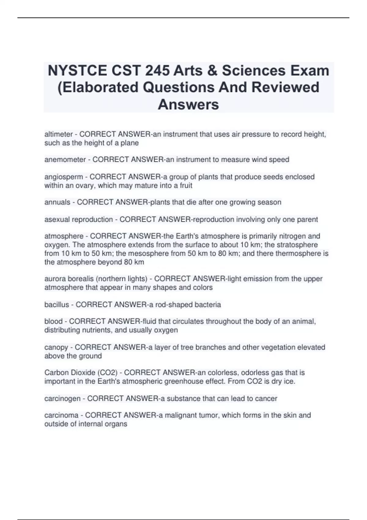 NYSTCE CST 245 Arts & Sciences Exam (Elaborated Questions And Reviewed Answers altimeter - CORRECT ANSWER-an instrument that uses air pressure to record height, such as the height of a plane anemometer - CORRECT ANSWER-an instrument to measure wind speed angiosperm - CORRECT ANSWER-a group of plants that produce seeds enclosed within an ovary, which may mature into a fruit annuals - CORRECT ANSWER-plants that die after one growing season asexual reproduction - CORRECT ANSWER-reproduction involving only one parent atmosphere - CORRECT ANSWER-the Earth's atmosphere is primarily nitrogen and oxygen. The atmosphere extends from the surface to about 10 km; the stratosphere from 10 km to 50 km; the mesosphere from 50 km to 80 km; and there thermosphere is the atmosphere beyond 80 km aurora borealis (northern lights) - CORRECT ANSWER-light emission from the upper atmosphere that appear in many shapes and colors bacillus - CORRECT ANSWER-a rod-shaped bacteria blood - CORRECT ANSWER-fluid that circulates throughout the body of an animal, distributing nutrients, and usually oxygen canopy - CORRECT ANSWER-a layer of tree branches and other vegetation elevated above the ground Carbon Dioxide (CO2) - CORRECT ANSWER-an colorless, odorless gas that is important in the Earth's atmospheric greenhouse effect. From CO2 is dry ice. carcinogen - CORRECT ANSWER-a substance that can lead to cancer carcinoma - CORRECT ANSWER-a malignant tumor, which forms in the skin and outside of internal organs