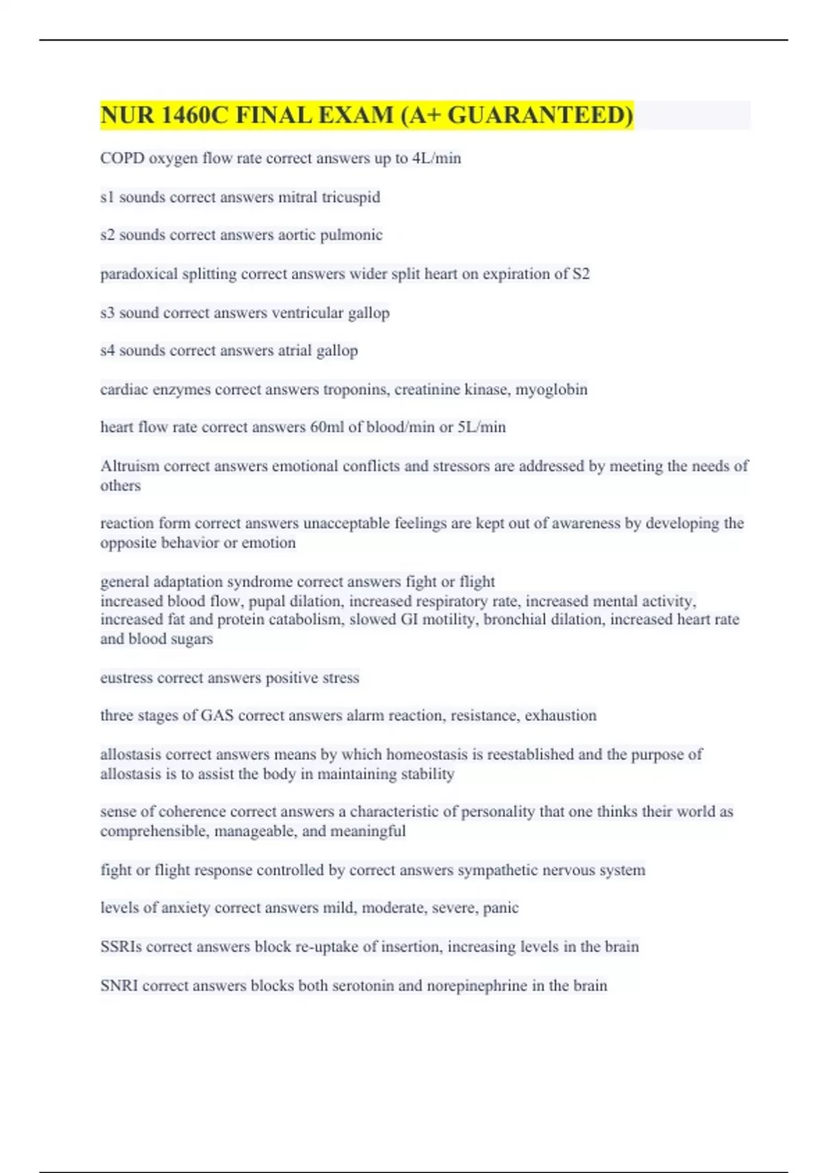 COPD oxygen flow rate correct answers up to 4L/min s1 sounds correct answers mitral tricuspid s2 sounds correct answers aortic pulmonic paradoxical splitting correct answers wider split heart on expiration of S2 s3 sound correct answers ventricular gallop s4 sounds correct answers atrial gallop cardiac enzymes correct answers troponins, creatinine kinase, myoglobin heart flow rate correct answers 60ml of blood/min or 5L/min Altruism correct answers emotional conflicts and stressors are addressed by meeting the needs of others reaction form correct answers unacceptable feelings are kept out of awareness by developing the opposite behavior or emotion general adaptation syndrome correct answers fight or flight increased blood flow, pupal dilation, increased respiratory rate, increased mental activity, increased fat and protein catabolism, slowed GI motility, bronchial dilation, increased heart rate and blood sugars eustress correct answers positive stress three stages of GAS correct answers alarm reaction, resistance, exhaustion allostasis correct answers means by which homeostasis is reestablished and the purpose of allostasis is to assist the body in maintaining stability sense of coherence correct answers a characteristic of personality that one thinks their world as comprehensible, manageable, and meaningful fight or flight response controlled by correct answers sympathetic nervous system levels of anxiety correct answers mild, moderate, severe, panic SSRIs correct answers block re-uptake of insertion, increasing levels in the brain SNRI correct answers blocks both serotonin and norepinephrine in the brain