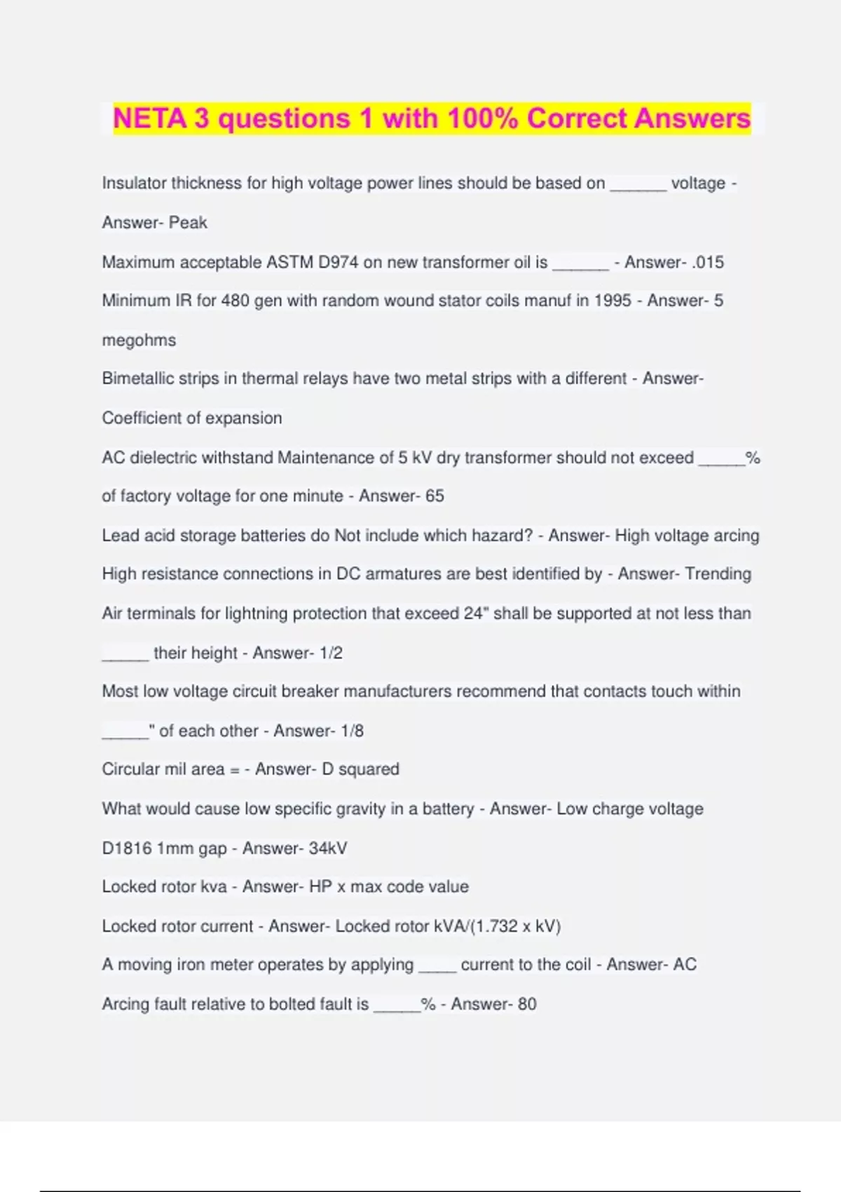 NETA 3 questions 1 with 100% Correct Answers Insulator thickness for high voltage power lines should be based on ______ voltage - Answer- Peak Maximum acceptable ASTM D974 on new transformer oil is ______ - Answer- .015 Minimum IR for 480 gen with random wound stator coils manuf in 1995 - Answer- 5 megohms Bimetallic strips in thermal relays have two metal strips with a different - Answer- Coefficient of expansion AC dielectric withstand Maintenance of 5 kV dry transformer should not exceed _____% of factory voltage for one minute - Answer- 65 Lead acid storage batteries do Not include which hazard? - Answer- High voltage arcing High resistance connections in DC armatures are best identified by - Answer- Trending Air terminals for lightning protection that exceed 24" shall be supported at not less than _____ their height - Answer- 1/2 Most low voltage circuit breaker manufacturers recommend that contacts touch within _____" of each other - Answer- 1/8 Circular mil area = - Answer- D squared What would cause low specific gravity in a battery - Answer- Low charge voltage D1816 1mm gap - Answer- 34kV Locked rotor kva - Answer- HP x max code value Locked rotor current - Answer- Locked rotor kVA/(1.732 x kV) A moving iron meter operates by applying ____ current to the coil - Answer- AC Arcing fault relative to bolted fault is _____% - Answer- 80