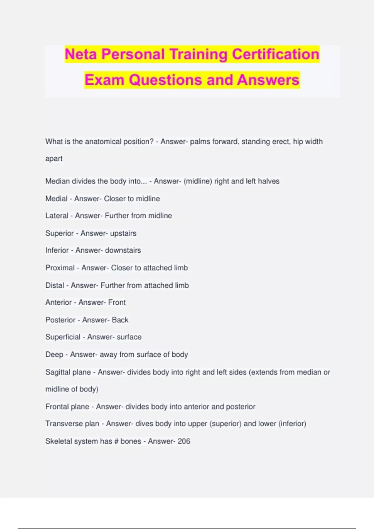 Neta Personal Training Certification Exam Questions and Answers What is the anatomical position? - Answer- palms forward, standing erect, hip width apart Median divides the body into... - Answer- (midline) right and left halves Medial - Answer- Closer to midline Lateral - Answer- Further from midline Superior - Answer- upstairs Inferior - Answer- downstairs Proximal - Answer- Closer to attached limb Distal - Answer- Further from attached limb Anterior - Answer- Front Posterior - Answer- Back Superficial - Answer- surface Deep - Answer- away from surface of body Sagittal plane - Answer- divides body into right and left sides (extends from median or midline of body) Frontal plane - Answer- divides body into anterior and posterior Transverse plan - Answer- dives body into upper (superior) and lower (inferior) Skeletal system has # bones - Answer- 206 Bones do the following four tasks: - Answer- 1- levers for muscles, 2- protect vital organs, 3- storage for essential minerals, 4-produces blood cells in the bone marrow Axial skeleton - Answer- (80 bones) skull, spinal column, sternum and ribs Appendicular Skeleton - Answer- (126 bones) upper and lower extremeties as well as shoulder and pelvic girdles Arm - Answer- Radius/Ulna/Humerus Leg - Answer- Tibia/Fibula/Femur Vertebral Column - Answer- 33 of the bones in the axial skeleton Top and bottom of vert column - Answer- top connects to cranium and bottom connects to sacrum... sacrum, lumbar, thorasic, cervical, cranium Sacrum - Answer- transmits body weight to hip joints through articulations with pelvic girdle Three Regions of Vert Column - Answer- cervical connects to cranium and has pivotal joint (7), thorasic (12) connects to ribs to provide support for thorax, lumbar (5) 4 types of bones - Answer- long, short, flat and irregular Articulation - Answer- junction between two adjacent bones Three types of joints - Answer- Synarthrodial, diarthrodial, amphiarthrodial Synarthrodial joints - Answer- tought fibrous connective tissue #immovable joint amphiarthrodial joints - Answer- pad or disk (between two vert for example) #slightly movable joint diarthrodial joint - Answer- also called synovial and freely move- also contain articular cartilage and joint capsule (shoulder, elbow, hip and knee) Ligaments - Answer- connect bone to bone and provide support for joints 6 Types of joints - Answer- gliding, hinge, saddle, pivot, ball and socket, ellipsoid Shoulder has three main bones - Answer- humerus, scapula, and clavicle Three types of muscle tissue - Answer- cardiac, smooth and skeletal Cardiac - Answer- walls of the heart (involuntary) Smooth - Answer- lines the internal organs (involuntary) Skeletal - Answer- accel, deccel, stabilize (voluntary)... 75 percent water, 20 percent contractile proteins, 5 percent high energy phosphates... over 600 different skeletal muscles Muscle fibers are made up of... - Answer- myofibrils- sacroplasm surrounds these and contains the mitochondria (powerhouse of the muscle) Myofilaments are... - Answer- within the myofribils in the muscle fibers... The two myofilaments are actin and myosin. Sarcomere are... - Answer- the smallest functional unit of the skeletal muscle fibers- overlap of the myofilaments