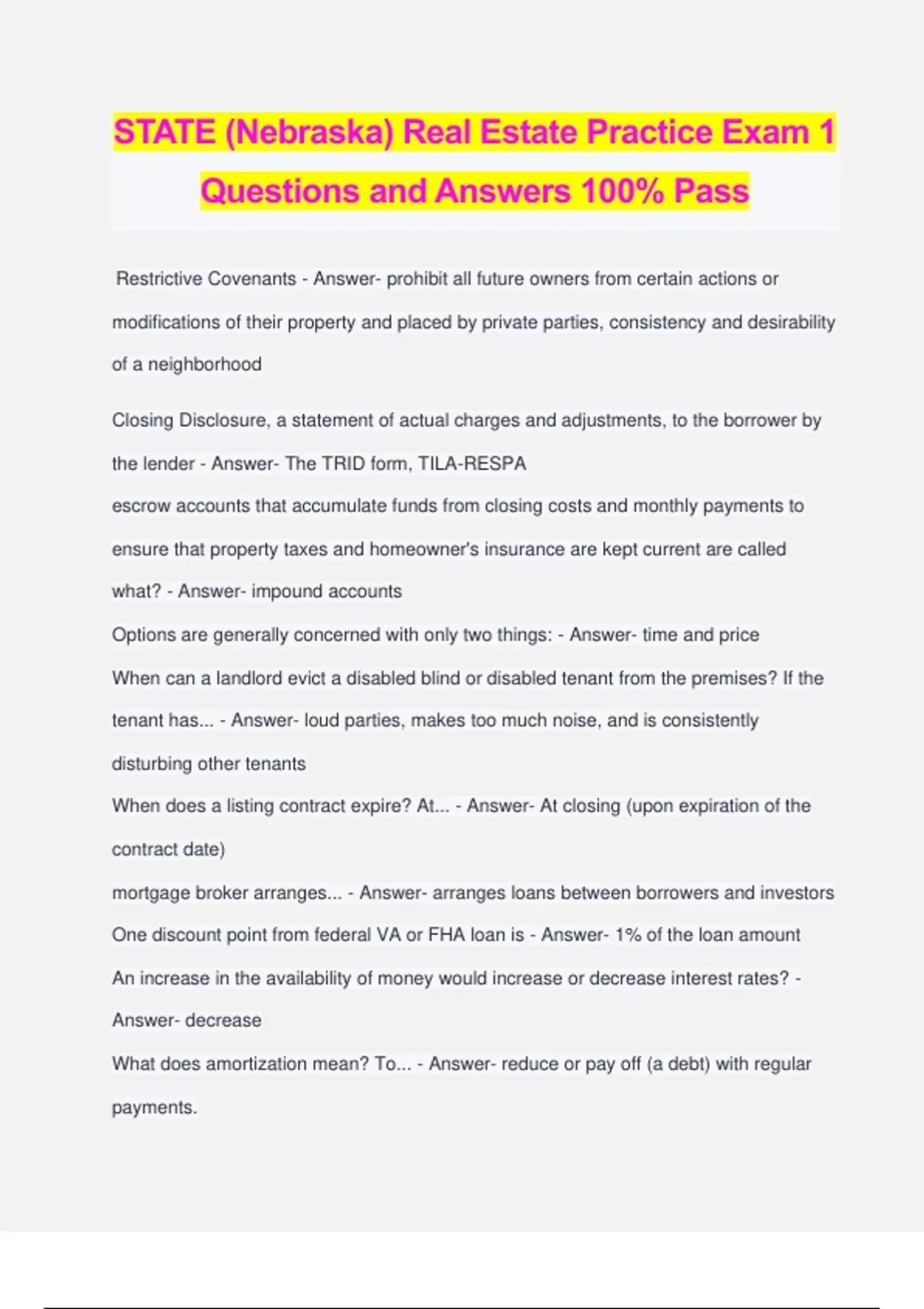 STATE (Nebraska) Real Estate Practice Exam 1 Questions and Answers 100% Pass