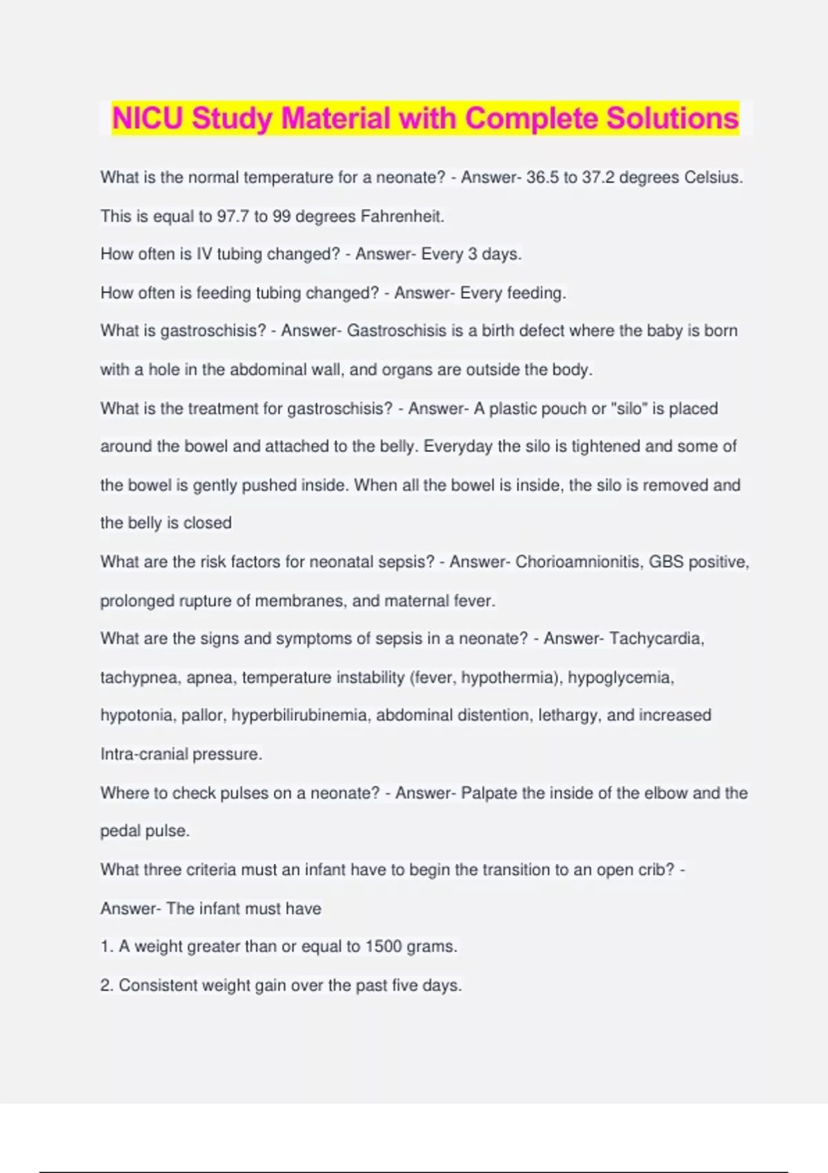 NICU Study Material with Complete Solutions What is the normal temperature for a neonate? - Answer- 36.5 to 37.2 degrees Celsius. This is equal to 97.7 to 99 degrees Fahrenheit. How often is IV tubing changed? - Answer- Every 3 days. How often is feeding tubing changed? - Answer- Every feeding. What is gastroschisis? - Answer- Gastroschisis is a birth defect where the baby is born with a hole in the abdominal wall, and organs are outside the body. What is the treatment for gastroschisis? - Answer- A plastic pouch or "silo" is placed around the bowel and attached to the belly. Everyday the silo is tightened and some of the bowel is gently pushed inside. When all the bowel is inside, the silo is removed and the belly is closed What are the risk factors for neonatal sepsis? - Answer- Chorioamnionitis, GBS positive, prolonged rupture of membranes, and maternal fever. What are the signs and symptoms of sepsis in a neonate? - Answer- Tachycardia, tachypnea, apnea, temperature instability (fever, hypothermia), hypoglycemia, hypotonia, pallor, hyperbilirubinemia, abdominal distention, lethargy, and increased Intra-cranial pressure. Where to check pulses on a neonate? - Answer- Palpate the inside of the elbow and the pedal pulse. What three criteria must an infant have to begin the transition to an open crib? - Answer- The infant must have 1. A weight greater than or equal to 1500 grams. 2. Consistent weight gain over the past five days. 3. Be an otherwise stable baby who is tolerating enteral feeds. When starting a crib wean, what temperature should we start the NTE on? - Answer- Start with the temperature the infant is requiring on ISC. What is a baby allowed to wear during the crib weaning process? - Answer- Diaper, onesie, sleeper, hat, and 1 blanket. That's all. What temperature must the baby have to be weaned down by 0.5 degrees celcius? - Answer- Temps greater than or equal to 36.7 degrees celcius will allow the baby to decrease the NTE by 0.5 degrees celcius during each care time. What is the low cutoff temperature for crib weaning, and what do we do when the baby has this temp? - Answer- 36.5 is the cutoff temp. Anything lower, and we need to turn up the NTE by 0.5 degrees. If the next consecutive temperature is below 36.5, switch back to ISC. What is the lowest NTE level, and what happens when the baby reaches it? - Answer- The lowest NTE level is 26 degrees. They must hold at 26 degrees NTE for 24 hours and demonstrate good axilllary temps and weight gain. After 24 hours, the baby can be put in the crib