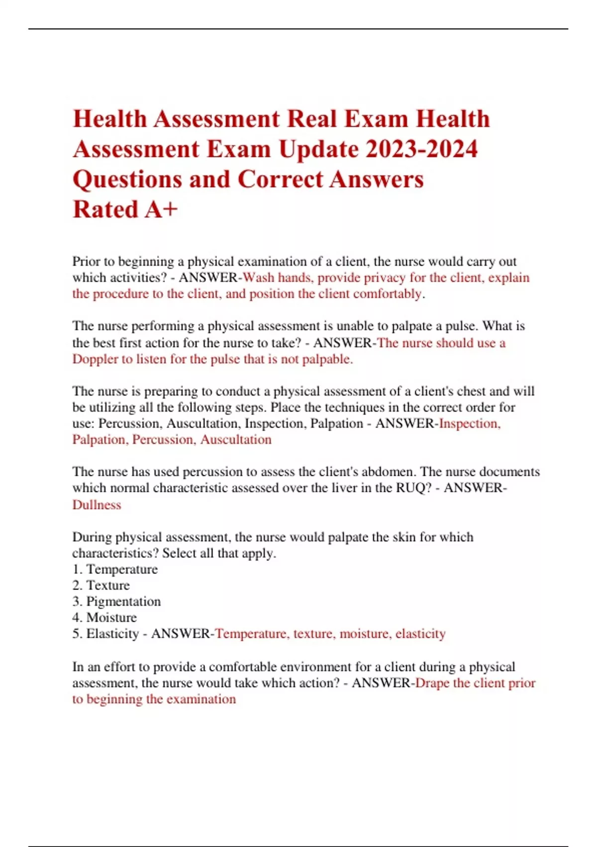 Health Assessment Real Exam Health Assessment Exam Update Questions and Correct Answers Rated A+