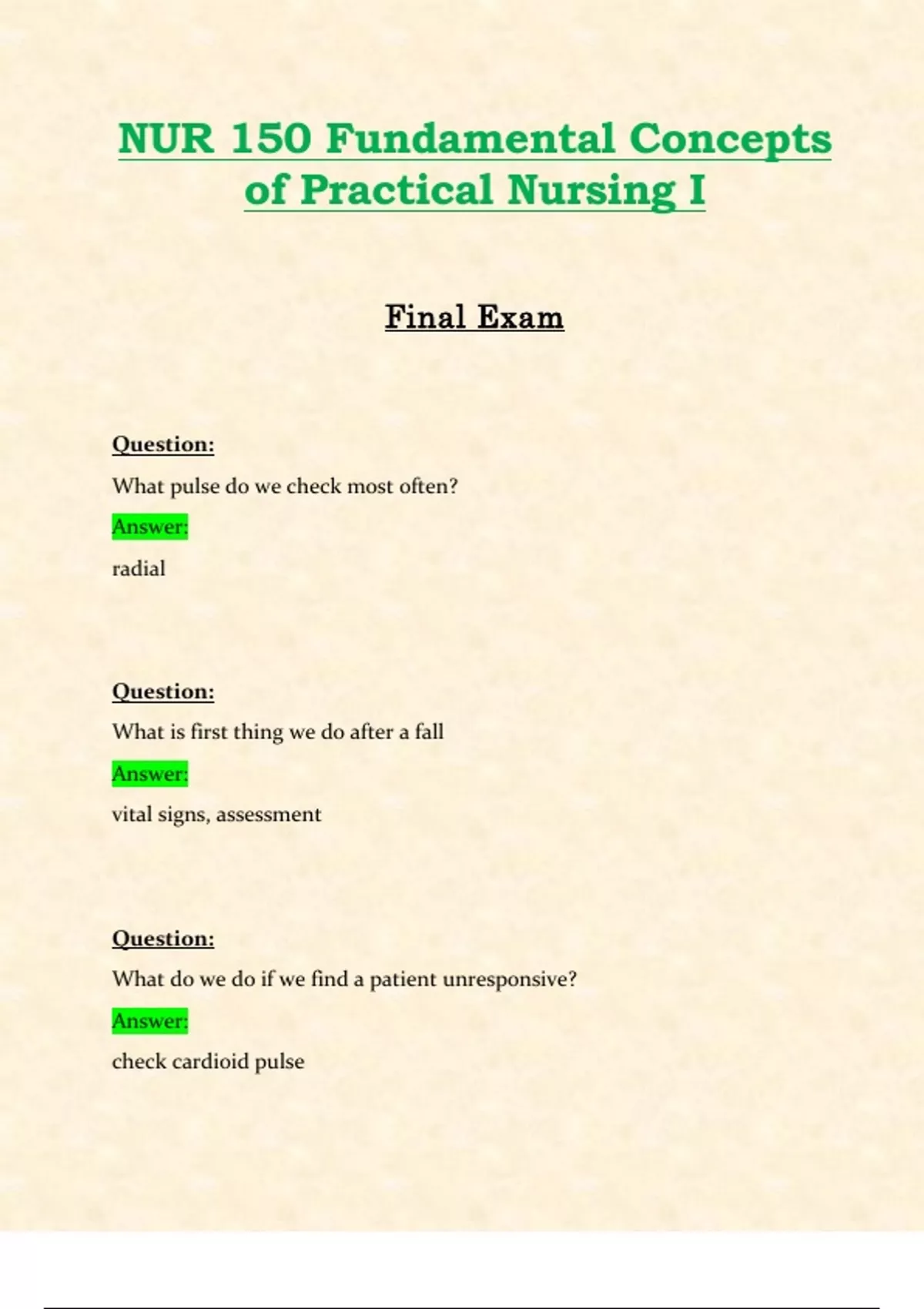 Final Exam: NUR150 / NUR 150 (Latest 2024 / 2025) Fundamental Concepts of Practical Nursing I Exam Review | Questions and Verified Answers | Grade A | Hondros College Q: What pulse do we check most often Answer: radial Q: What is first thing we do after a fall Answer: vital signs...