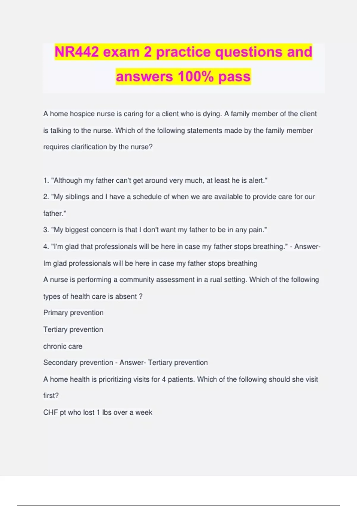 NR442 exam 2 practice questions and answers 100% pass A home hospice nurse is caring for a client who is dying. A family member of the client is talking to the nurse. Which of the following statements made by the family member requires clarification by the nurse? 1. "Although my father can't get around very much, at least he is alert." 2. "My siblings and I have a schedule of when we are available to provide care for our father." 3. "My biggest concern is that I don't want my father to be in any pain." 4. "I'm glad that professionals will be here in case my father stops breathing." - Answer- Im glad professionals will be here in case my father stops breathing A nurse is performing a community assessment in a rual setting. Which of the following types of health care is absent ? Primary prevention Tertiary prevention chronic care Secondary prevention - Answer- Tertiary prevention A home health is prioritizing visits for 4 patients. Which of the following should she visit first? CHF pt who lost 1 lbs over a week Pt w/osteoarthritis of the knee and reports pain when ambulating Pt with alzheimers and does not remember the year Pt w/type 2 dm and reports new fissures b/w her toes - Answer- Pt w/ type 2 dm and reports new fissures b/w her toes A home health nurse is performing an assessment of an older adult clients home. Which of the following findings is a potential hazard? Hot water set at 115F A night light in each room A secure large area rug in living room