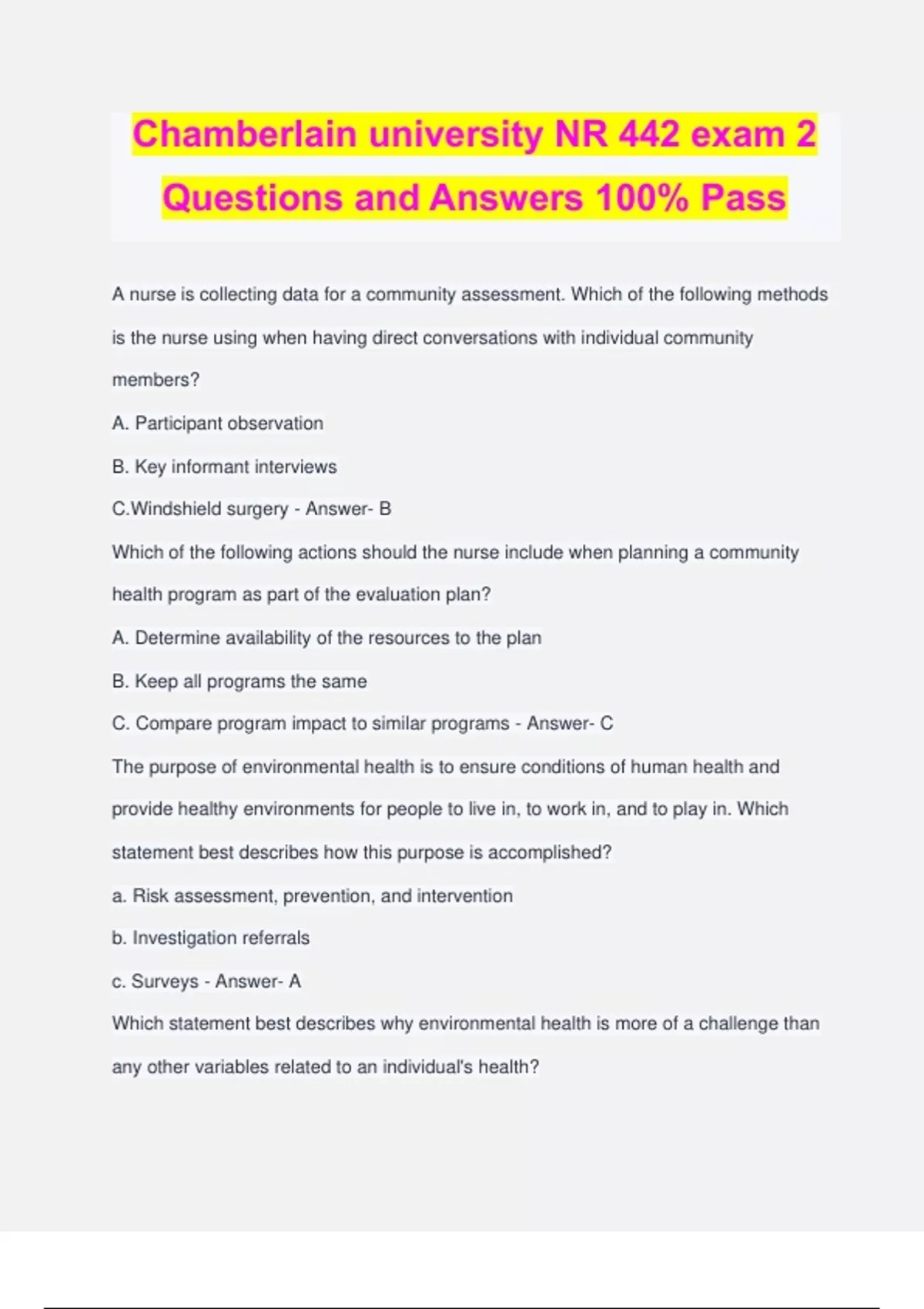 Chamberlain university NR 442 exam 2 Questions and Answers 100% Pass A nurse is collecting data for a community assessment. Which of the following methods is the nurse using when having direct conversations with individual community members? A. Participant observation B. Key informant interviews C.Windshield surgery - Answer- B Which of the following actions should the nurse include when planning a community health program as part of the evaluation plan? A. Determine availability of the resources to the plan B. Keep all programs the same C. Compare program impact to similar programs - Answer- C The purpose of environmental health is to ensure conditions of human health and provide healthy environments for people to live in, to work in, and to play in. Which statement best describes how this purpose is accomplished? a. Risk assessment, prevention, and intervention b. Investigation referrals c. Surveys - Answer- A Which statement best describes why environmental health is more of a challenge than any other variables related to an individual's health? A. Environmental health depends on social neighborhoods as well as geography B. Environmental health depends on the number of clinics C. Environmental health requires social, economic, and political changes to improve - Answer- C Which statement best describes the relationship between health and the environment? A. A healthy environment increases years of healthy living and quality of living according to research B.Health does not correlate with the environment C. The environment decreases years of healthy living and quality of living according to research - Answer- A The girl scouts had a clean up day so they could canoe in a stream that was full of trash. Which actions should be taken by the nurse in the local community? A. Discuss with community members about the problem, and its effect on the environment B. Fight for harsher penalties and do not trash laws C. Call local officials - Answer- A Which of the following statements describes a food desert? a. A The inability to store foods at an acceptable temperature b. A geographical area, or neighborhood, with little or no access to healthy food C.An area that lacks water - Answer- B