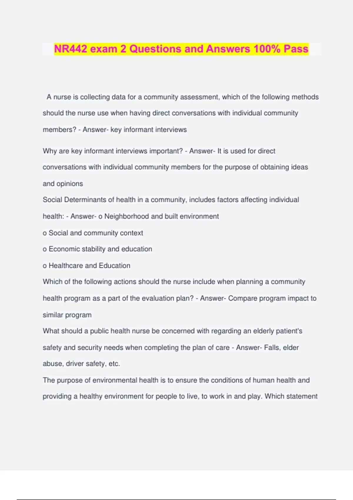 NR442 exam 2 Questions and Answers 100% Pass A nurse is collecting data for a community assessment, which of the following methods should the nurse use when having direct conversations with individual community members? - Answer- key informant interviews Why are key informant interviews important? - Answer- It is used for direct conversations with individual community members for the purpose of obtaining ideas and opinions Social Determinants of health in a community, includes factors affecting individual health: - Answer- o Neighborhood and built environment o Social and community context o Economic stability and education o Healthcare and Education Which of the following actions should the nurse include when planning a community health program as a part of the evaluation plan? - Answer- Compare program impact to similar program What should a public health nurse be concerned with regarding an elderly patient's safety and security needs when completing the plan of care - Answer- Falls, elder abuse, driver safety, etc. The purpose of environmental health is to ensure the conditions of human health and providing a healthy environment for people to live, to work in and play. Which statement best describes how this purpose is accomplished? - Answer- Risk assessment, prevention, and intervention Which statement best describes why environmental health is more of a challenge than other variables related to an individual's health? - Answer- Environment health requires social, economic, and political changes to improve