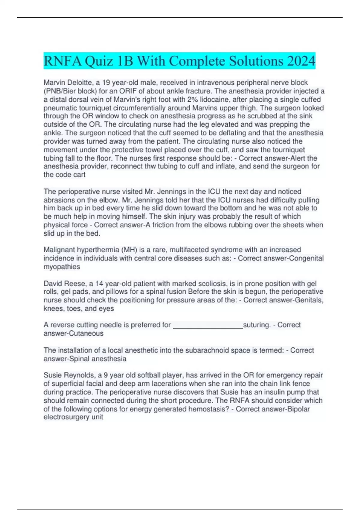 Marvin Deloitte, a 19 year-old male, received in intravenous peripheral nerve block (PNB/Bier block) for an ORIF of about ankle fracture. The anesthesia provider injected a a distal dorsal vein of Marvin's right foot with 2% lidocaine, after placing a single cuffed pneumatic tourniquet circumferentially around Marvins upper thigh. The surgeon looked through the OR window to check on anesthesia progress as he scrubbed at the sink outside of the OR. The circulating nurse had the leg elevated and was prepping the ankle. The surgeon noticed that the cuff seemed to be deflating and that the anesthesia provider was turned away from the patient. The circulating nurse also noticed the movement under the protective towel placed over the cuff, and saw the tourniquet tubing fall to the floor. The nurses first response should be: - Correct answer-Alert the anesthesia provider, reconnect thw tubing to cuff and inflate, and send the surgeon for the code cart The perioperative nurse visited Mr. Jennings in the ICU the next day and noticed abrasions on the elbow. Mr. Jennings told her that the ICU nurses had difficulty pulling him back up in bed every time he slid down toward the bottom and he was not able to be much help in moving himself. The skin injury was probably the result of which physical force - Correct answer-A friction from the elbows rubbing over the sheets when slid up in the bed. Malignant hyperthermia (MH) is a rare, multifaceted syndrome with an increased incidence in individuals with central core diseases such as: - Correct answer-Congenital myopathies David Reese, a 14 year-old patient with marked scoliosis, is in prone position with gel rolls, gel pads, and pillows for a spinal fusion Before the skin is begun, the perioperative nurse should check the positioning for pressure areas of the: - Correct answer-Genitals, knees, toes, and eyes answer-Cutaneous The installation of a local anesthetic into the subarachnoid space is termed: - Correct answer-Spinal anesthesia Susie Reynolds, a 9 year old softball player, has arrived in the OR for emergency repair of superficial facial and deep arm lacerations when she ran into the chain link fence during practice. The perioperative nurse discovers that Susie has an insulin pump that should remain connected during the short procedure. The RNFA should consider which of the following options for energy generated hemostasis? - Correct answer-Bipolar electrosurgery unit