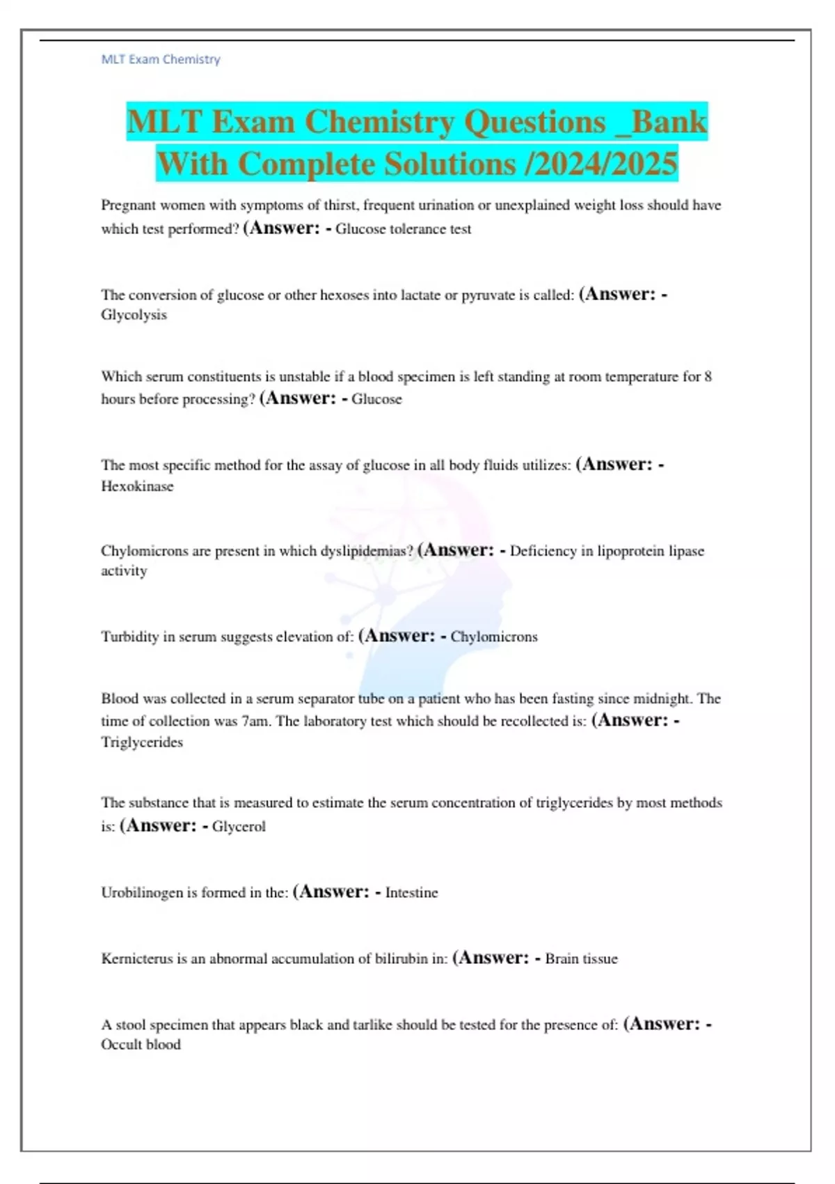 MLT Exam Chemistry Questions _Bank With Complete Solutions /2024/2025,MLT Exam Chemistry Questions _Bank With Complete Solutions /2024/2025,MLT Exam Chemistry Questions _Bank With Complete Solutions /2024/2025