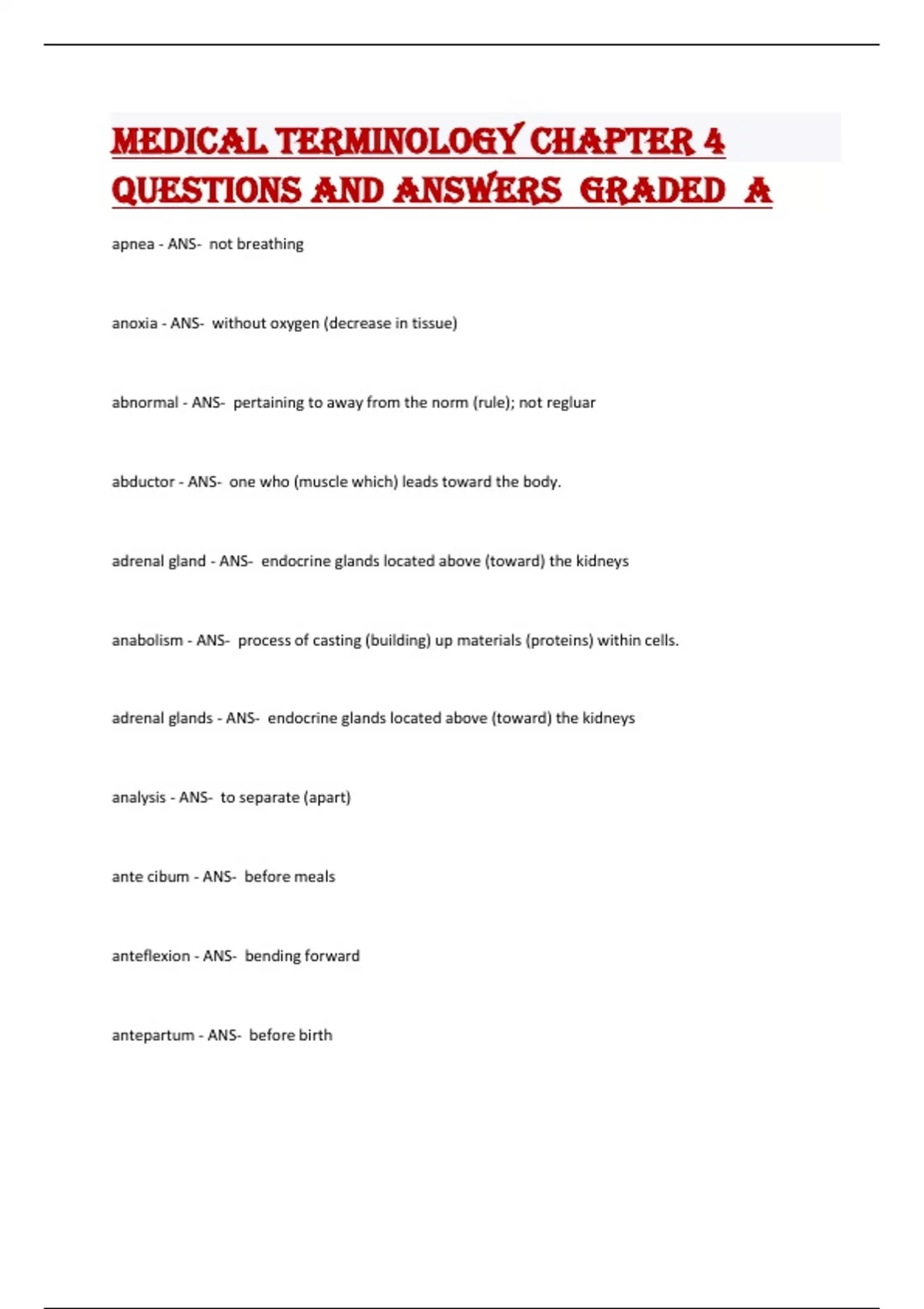 Medical Terminology Chapter 4 Questions and Answers Graded A apnea - ANS- not breathing anoxia - ANS- without oxygen (decrease in tissue) abnormal - ANS- pertaining to away from the norm (rule); not regluar abductor - ANS- one who (muscle which) leads toward the body. adrenal gland - ANS- endocrine glands located above (toward) the kidneys anabolism - ANS- process of casting (building) up materials (proteins) within cells. adrenal glands - ANS- endocrine glands located above (toward) the kidneys analysis - ANS- to separate (apart) ante cibum - ANS- before meals anteflexion - ANS- bending forward antepartum - ANS- before birth antibiotic - ANS- pertaining to against life (germ life) antibody - ANS- protein substance made in the body to destroy foreign antigens antisepsis - ANS- condition against infection antitoxin - ANS- a substance (antibody) produced in response to and capable of neutralizing a toxin autoimmune disease - ANS- a condition related to making antibodies against one's own (auto-) cells and tissues bifurcation - ANS- forking (branching) into two; as the trachea bifurcates into two individual tubes. bilateral - ANS- pertaining to two sides bradycardia - ANS- condition of slow heartbeat catabolism - ANS- process of casting down materials (sugar) to release energy in cells. congenital anomaly - ANS- irregularity at birth connective - ANS- to lie (bind) together. contraindication - ANS- to point out against; as reasons why a drug should not be taken. contralateral - ANS- pertaining to opposite side dehydration - ANS- condition of lack of water diameter - ANS- to measure through; as the diameter of the circle diarrhea - ANS- to flow through; water is not properly absorbed through the walls of the colon. dialysis - ANS- complete separation; two types are hemodialysis and peritoneal dialysis. dyspnea - ANS- difficult breathing dysentery - ANS- abnormal and painful condition of the intestines dysplasia - ANS- abnormal ("bad") development of formation ectopic pregnancy - ANS- pregnancy out of the normal place (usually in the fallopian tubes) endocardium - ANS- inner lining (membrane) of the heart endoscope - ANS- instrument to view within the body endotracheal - ANS- pertaining to within the trachea epithelium - ANS- skin cell euphoria - ANS- good feeling euthyroid - ANS- normal thyroid function exophthalmos - ANS- eyeballs that protrude hemiglossectomy - ANS- removal of half the tongue hyperglycemia - ANS- increase in blood sugar hyperplasia - ANS- condition of increased formation (increase in number of cells) hypertrophy - ANS- increase in development; increase in cell size. hypodermic injection - ANS- use of a needle and syringe to force liquid under the skin. hypoglycemia - ANS- decrease in blood sugar insomniac - ANS- pertaining to inability to sleep incision - ANS- process of cutting into;sectioning infracostal - ANS- pertaining to below the ribs intercostal - ANS- pertaining to between the ribs intravenous - ANS- pertaining to withing a vein macrocephaly - ANS- pertaining to an enlarged head; congenital anomaly. malaise - ANS- feeling of discomfort; "bad feeling" malignant - ANS- harmful, bad; cancerous condition metacarpal bones - ANS- five hand bones (beyond the wrist) metamorphosis - ANS- condition of change of shape or form metastasis - ANS- beyond control; spreading of a malignant tumor microscope - ANS- instrument to view small objects neonatal - ANS- pertaining to a newborn (infant) neoplasm - ANS- new growth; new formation (tumor) panycytopenia - ANS- condition of decrease in all cells (blood cells) paralysis - ANS- abnormal destruction (of nerves) to loss of muscle function parathyroid glands - ANS- endocrine glands located near (on the dorsal side of) the thyroid gland. percutaneous - ANS- pertaining to through the skin pericardium - ANS- membrane surrounding the heat polymorphonuclear - ANS- pertaining to many-shaped nucleus; a type of white blood cell. polyneuritis - ANS- inflammation of many nerves postmortem - ANS- after death postpartum - ANS- after childbirth; most often refers to the mother precancerous - ANS- pertaining to before cancer; a lesion that may become cancerous prenatal - ANS- pertaining to before birth prodrome - ANS- signs and symptoms that appear before the onset of a more severe illness. prolapse - ANS- sliding forward or downward prosthesis - ANS- artificial limb or part of the body (literally, to put or place forward relapse - ANS- a sliding back; recurrence of symptoms of a disease