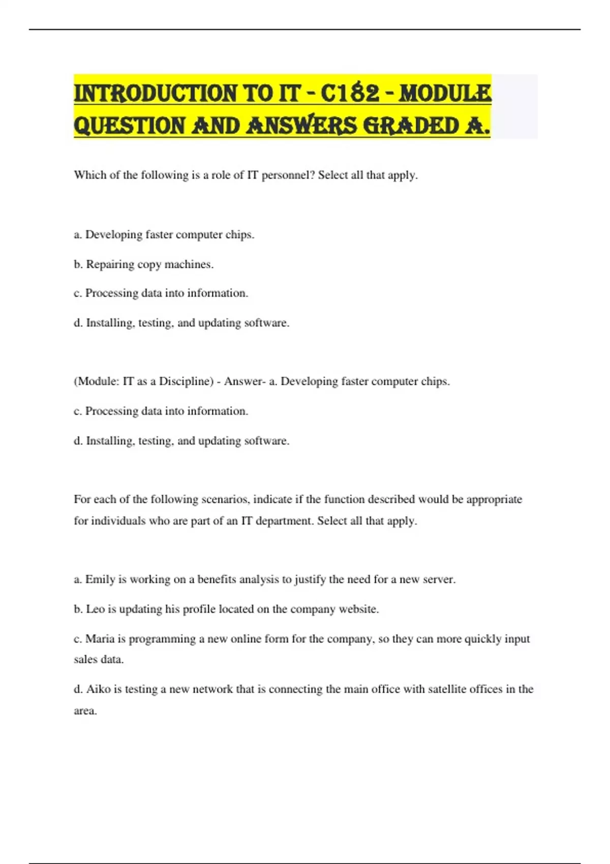Which of the following is a role of IT personnel? Select all that apply. a. Developing faster computer chips. b. Repairing copy machines. c. Processing data into information. d. Installing, testing, and updating software. (Module: IT as a Discipline) - Answer- a. Developing faster computer chips. c. Processing data into information. d. Installing, testing, and updating software. For each of the following scenarios, indicate if the function described would be appropriate for individuals who are part of an IT department. Select all that apply. a. Emily is working on a benefits analysis to justify the need for a new server. b. Leo is updating his profile located on the company website. c. Maria is programming a new online form for the company, so they can more quickly input sales data. d. Aiko is testing a new network that is connecting the main office with satellite offices in the area. (Module: IT as a Discipline) - Answer- a. Emily is working on a benefits analysis to justify the need for a new server. c. Maria is programming a new online form for the company, so they can more quickly input sales data. d. Aiko is testing a new network that is connecting the main office with satellite offices in the area. Which of the following employees would be considered IT personnel? a. Jeff, who works in human resources screening electronic résumés of potential hires. b. Maria, a computer programmer who debugs software issues for company users. c. Yuki, who writes text for client websites. d. Nadir, who creates marketing plans based on aggregated company data. (Module: IT as a Discipline) - Answer- b. Maria, a computer programmer who debugs software issues for company users. Which of the description of duties below would be for a System Administrator? a. This individual is in charge of ensuring that the network is working properly. Duties may include connecting devices using cable, configuring individual employee computers, working with the network hardware, and troubleshooting. b. This individual has responsibility for developing new software applications to improve the functionality of an organization's information technology. c. This individual updates an organization's computer hardware and software, performs troubleshooting, and maintains the operating system of a computer system.