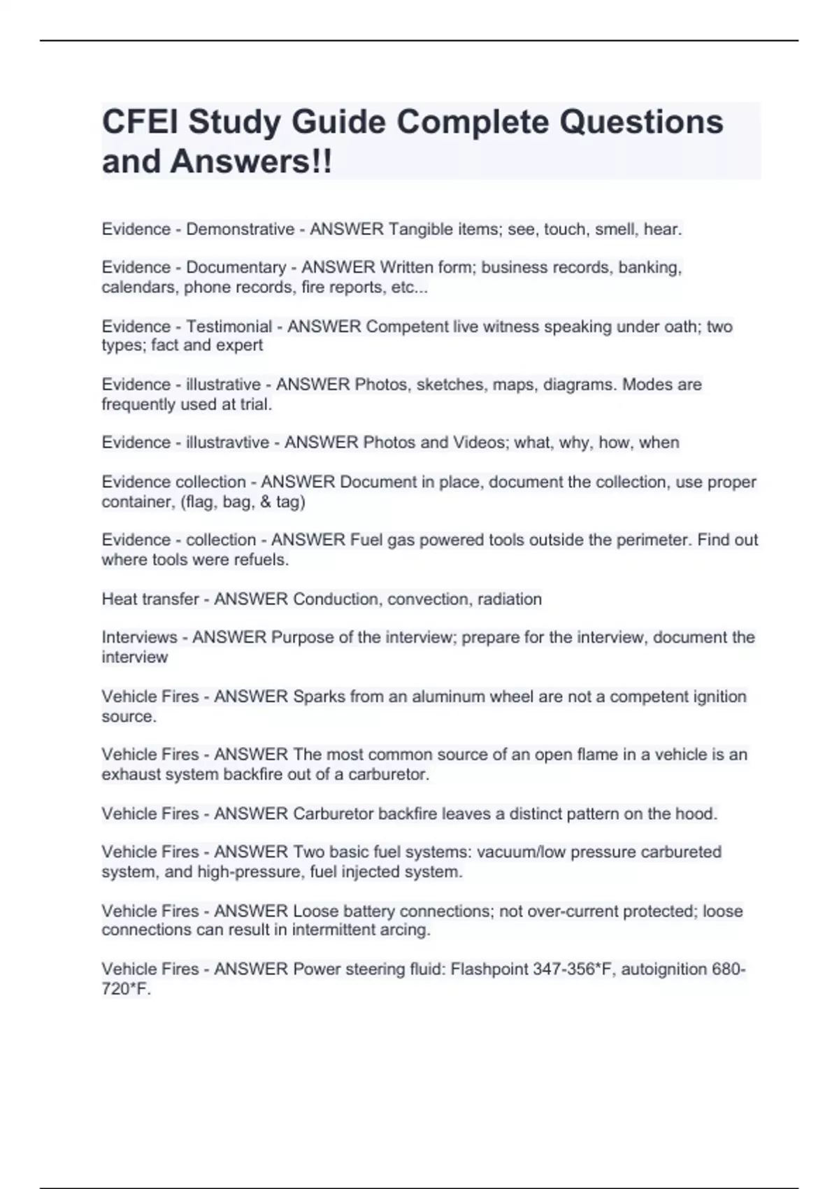 CFEI Study Guide Complete Questions and Answers!! Evidence - Demonstrative - ANSWER Tangible items; see, touch, smell, hear. Evidence - Documentary - ANSWER Written form; business records, banking, calendars, phone records, fire reports, etc... Evidence - Testimonial - ANSWER Competent live witness speaking under oath; two types; fact and expert Evidence - illustrative - ANSWER Photos, sketches, maps, diagrams. Modes are frequently used at trial. Evidence - illustravtive - ANSWER Photos and Videos; what, why, how, when Evidence collection - ANSWER Document in place, document the collection, use proper container, (flag, bag, & tag) Evidence - collection - ANSWER Fuel gas powered tools outside the perimeter. Find out where tools were refuels. Heat transfer - ANSWER Conduction, convection, radiation Interviews - ANSWER Purpose of the interview; prepare for the interview, document the interview Vehicle Fires - ANSWER Sparks from an aluminum wheel are not a competent ignition source. Vehicle Fires - ANSWER The most common source of an open flame in a vehicle is an exhaust system backfire out of a carburetor. Vehicle Fires - ANSWER Carburetor backfire leaves a distinct pattern on the hood. Vehicle Fires - ANSWER Two basic fuel systems: vacuum/low pressure carbureted system, and high-pressure, fuel injected system. Vehicle Fires - ANSWER Loose battery connections; not over-current protected; loose connections can result in intermittent arcing. Vehicle Fires - ANSWER Power steering fluid: Flashpoint 347-356*F, autoignition 680-720*F. Vehicle Fires - ANSWER Automatic Transmission Fluid: Flashpoint 302-536*F, autoignition 626-716*F. Vehicle Fires - ANSWER Overcharging a battery does not cause it to explode. Explosions - ANSWER Low order damage: characterized by walls bulge out or laid down, virtually intact, next to the structure. roofs slightly left. Explosions - ANSWER High order damage: shattering of the structure, producing small