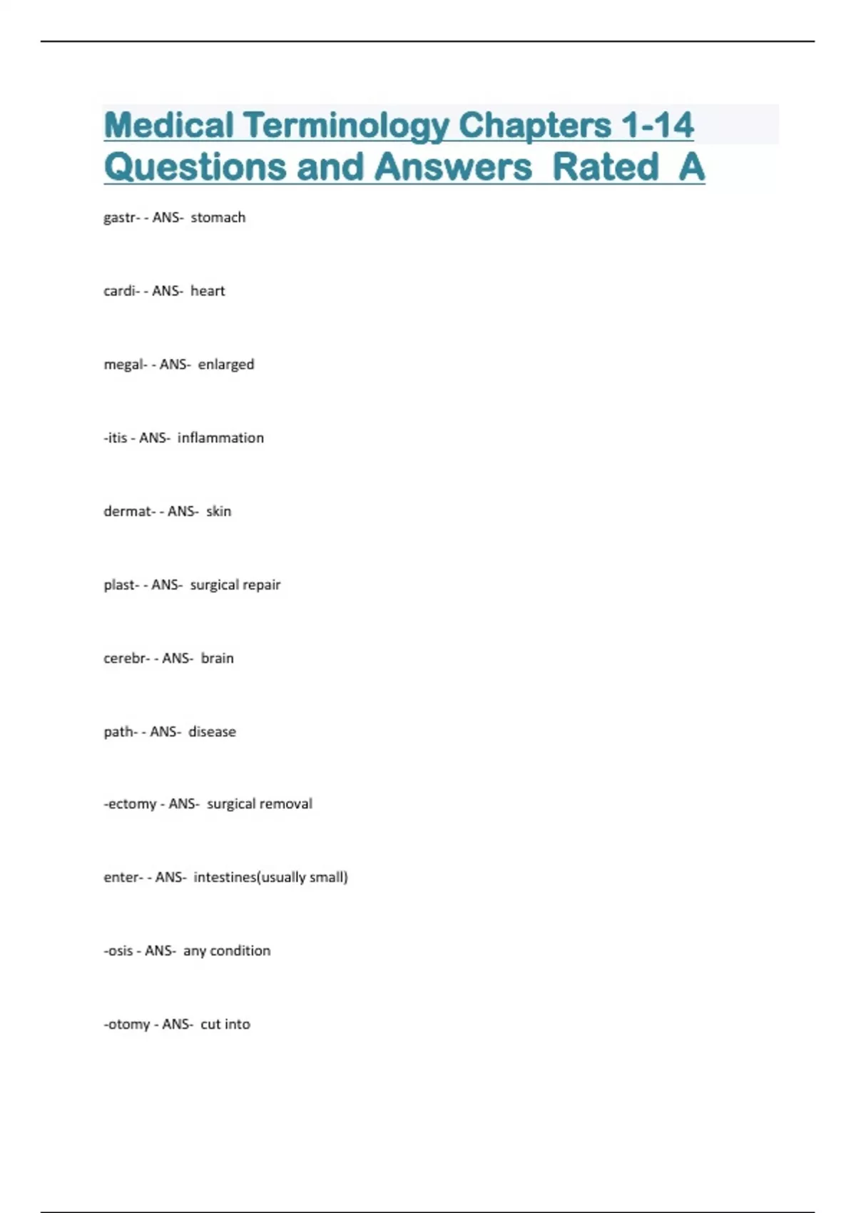 Medical Terminology Chapters 1-14 Questions and Answers Rated A gastr- - ANS- stomach cardi- - ANS- heart megal- - ANS- enlarged -itis - ANS- inflammation dermat- - ANS- skin plast- - ANS- surgical repair cerebr- - ANS- brain path- - ANS- disease -ectomy - ANS- surgical removal enter- - ANS- intestines(usually small) -osis - ANS- any condition -otomy - ANS- cut into aden- - ANS- gland angi- - ANS- vessel -oma - ANS- tumor nephr- - ANS- kidney hepat- - ANS- liver arthr- - ANS- joint blephar- - ANS- eyelid -ologist - ANS- specialist rhin- - ANS- nose gingiv- - ANS- gum -malacia - ANS- soft -ology - ANS- the study of spasm - ANS- involuntary contraction -algia - ANS- pain crani- - ANS- skull end- - ANS- inside, within hemi- - ANS- half -oid - ANS- like hyper- - ANS- above, more than normal cyst- - ANS- sac containing fluid chole- - ANS- bile hypo- - ANS- under -scop- - ANS- observe hyster- - ANS- uterus -ostomy - ANS- create an opening para- - ANS- beside, beyond -lysis - ANS- loosening, destruction cervic- - ANS- neck chondr- - ANS- cartilage cyan- - ANS- blue hem(at)- - ANS- blood ost- - ANS- bone psycho- - ANS- mind lip- - ANS- fat my- - ANS- muscle lith- - ANS- stone ophthalmopt- - ANS- eye proct- - ANS- anus cost- - ANS- rib -gram - ANS- record acro- - ANS- extremities rhexis - ANS- break, burst carcin- - ANS- cancer -penia - ANS- decrease gen- - ANS- original, production burso- - ANS- sac retr(o)- - ANS- backwards trip- - ANS- rub, friction strept- - ANS- twist