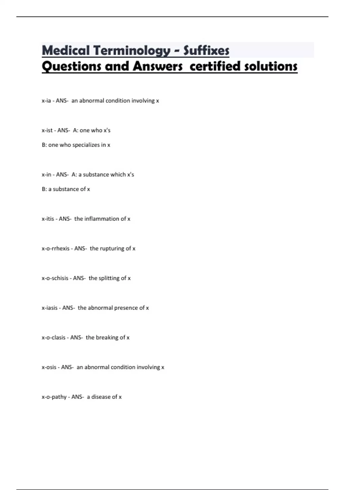 Medical Terminology - Suffixes Questions and Answers certified solutions x-ia - ANS- an abnormal condition involving x x-ist - ANS- A: one who x's B: one who specializes in x x-in - ANS- A: a substance which x's B: a substance of x x-itis - ANS- the inflammation of x x-o-rrhexis - ANS- the rupturing of x x-o-schisis - ANS- the splitting of x x-iasis - ANS- the abnormal presence of x x-o-clasis - ANS- the breaking of x x-osis - ANS- an abnormal condition involving x x-o-pathy - ANS- a disease of x x-o-megaly - ANS- the enlargement of x x-o-phagy - ANS- the ingestion of x x-ize - ANS- A: to x B: to make something x x-o-genesis - ANS- the production of x x-o-poiesis - ANS- the formation of x x-o-kinesis - ANS- the movement of x x-algia - ANS- A: pain in x B: pain involving x x-o-dynia - ANS- A: pain in x B: pain involving x x-o-plegia - ANS- the paralysis of x x-o-penia - ANS- a deficiency of x x-o-rrhagia - ANS- A: the rapid flowing of x B: the rapid flowing of something from x x-o-malacia - ANS- the softening of x x-o-necrosis - ANS- the death of x x-o-stenosis - ANS- the narrowing of x x-o-sclerosis - ANS- the hardening of x x-optosis - ANS- the downward displacement of x x-agra - ANS- A: gouty pain in x B: gouty pain involving x x-o-rrhea - ANS- A: the flowing of x B: the flowing of something from x x-edema - ANS- the swelling of x x-o-cele - ANS- the protrusion of x x-o-lith - ANS- A: a calculus in x B: a calculus involving x x-o-spasm - ANS- a spasm of x x-ismus - ANS- a spasm of x x-ectopia - ANS- the displacement of x x-ectasia - ANS- the distension of x x-o-plasia - ANS- the formation of x x-o-dysplasia - ANS- the defective formation of x x-o-trophy - ANS- the growth/nourishment of x x-o-dystrophy - ANS- the defective growth of x x-atrophy - ANS- the lack of growth of x x-asthenia - ANS- the lack of strength of x x-o-therapy - ANS- treatment by means of x x-iatry - ANS- the healing of x x-o-stasis - ANS- the stopping of x x-o-plasty - ANS- the surgical repairing of x x-o-centesis - ANS- the surgical puncturing of x x-o-rrhaphy - ANS- the suturing of x x-o-tomy - ANS- the cutting of x x-ectomy - ANS- the cutting out of x x-o-stomy - ANS- the making of an opening in x x-ics - ANS- the science of x x-ic-ist - ANS- one who specializes in the science of x x-o-logy - ANS- the study of x x-o-scopy - ANS- the examination of x x-o-metry - ANS- the measurement of x x-o-graphy - ANS- the recording of x x-o-pexy - ANS- diagnostic: the adhesion of x