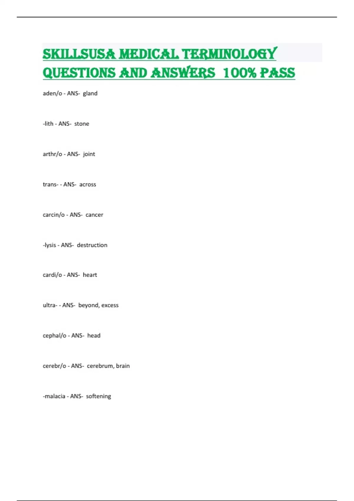 SKILLSUSA MEDICAL TERMINOLOGY Questions and Answers 100% pass aden/o - ANS- gland -lith - ANS- stone arthr/o - ANS- joint trans- - ANS- across carcin/o - ANS- cancer -lysis - ANS- destruction cardi/o - ANS- heart ultra- - ANS- beyond, excess cephal/o - ANS- head cerebr/o - ANS- cerebrum, brain -malacia - ANS- softening bi- - ANS- two cholecyst/o - ANS- gallbladder col/o - ANS- colon -megaly - ANS- enlargement cyst/o - ANS- sac containing fluid; bladder di- - ANS- two cyt/o - ANS- cell -oid - ANS- resembling derm/o - ANS- skin -ology - ANS- study of dermat/o - ANS- skin diplo- - ANS- double hemi- - ANS- half encephal/o - ANS- brain enter/o - ANS- small intestine -ostomy - ANS- surgically create an opening erythr/o - ANS- red -otomy - ANS- cutting into macro- - ANS- large esophag/o - ANS- esophagus gastr/o - ANS- stomach -parous - ANS- giving birth micro- - ANS- small gloss/o - ANS- tongue -pathy - ANS- disease gynec/o - ANS- female mono- - ANS- one hem/o - ANS- blood hemat/o - ANS- blood multi- - ANS- many -penia - ANS- few hepat/o - ANS- liver hyster/o - ANS- uterus -pexy - ANS- surgical fixation poly- - ANS- many ile/o - ANS- ileum leuk/o - ANS- white quad- - ANS- four