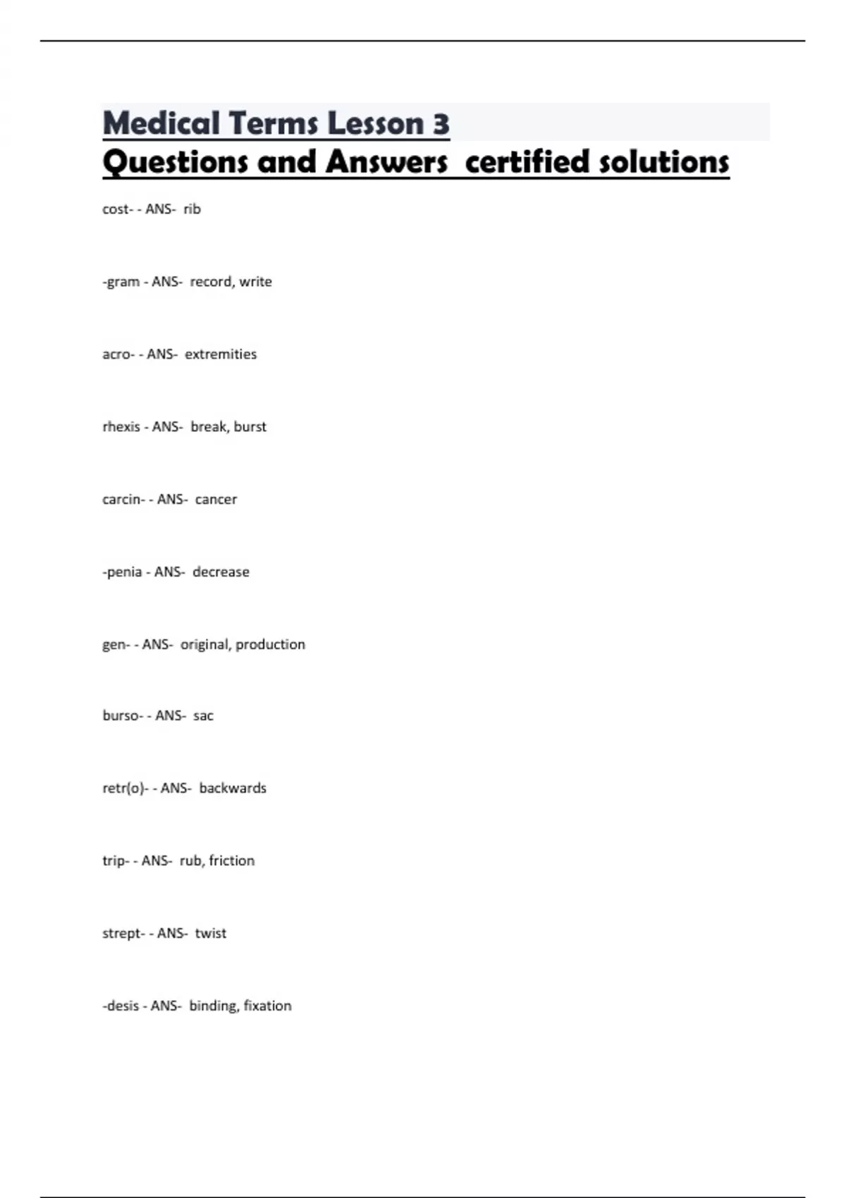Medical Terms Lesson 3 Questions and Answers certified solutions cost- - ANS- rib -gram - ANS- record, write acro- - ANS- extremities rhexis - ANS- break, burst carcin- - ANS- cancer -penia - ANS- decrease gen- - ANS- original, production burso- - ANS- sac retr(o)- - ANS- backwards trip- - ANS- rub, friction strept- - ANS- twist -desis - ANS- binding, fixation mani- - ANS- madness, mental disturbance glosso- - ANS- tongue -trophy - ANS- development growth supra- - ANS- above, over -ptosis - ANS- falling, drooping dyn - ANS- pain mast - ANS- breast -rrhaphy - ANS- suture dent- - ANS- teeth cephal- - ANS- head auto- - ANS- self epi- - ANS- upon, in addition to hydro - ANS- water