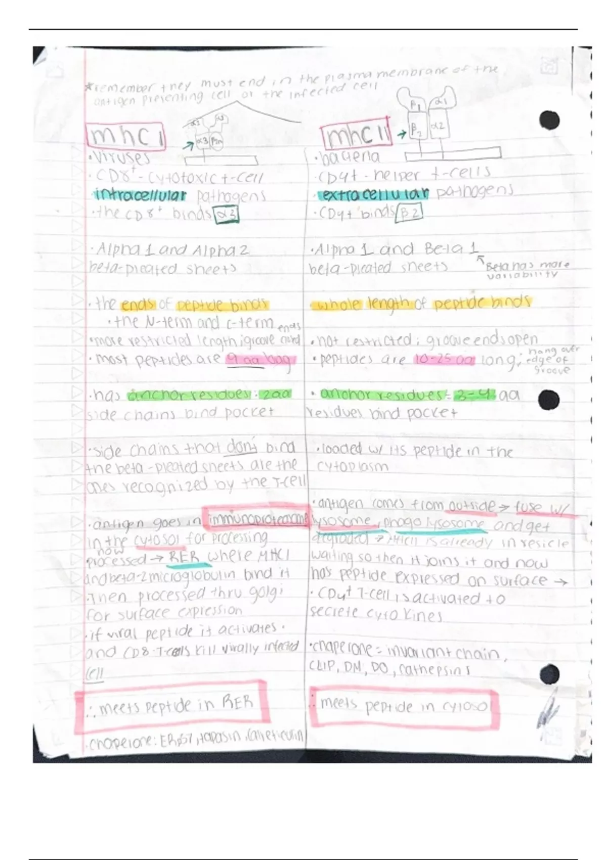 This is for immunology chapter 5. It is a comparison of MHCI vs MHCII. it includes its pathway, its chaperones, its chains, and other details. I could make it neater and more in-depth if needed, just let me know.