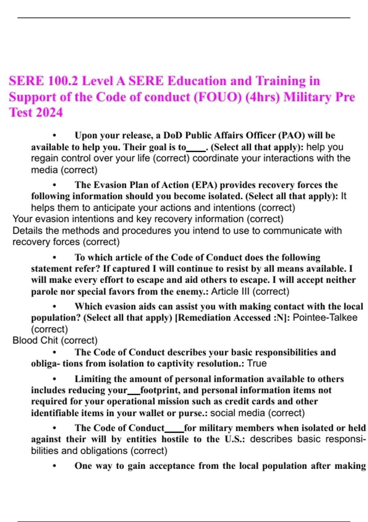 SERE 100.2 Level A SERE Education and Training in Support of the Code of Conduct (FOUO) (4 hrs) Military Pre Test exam solution complete update 2024