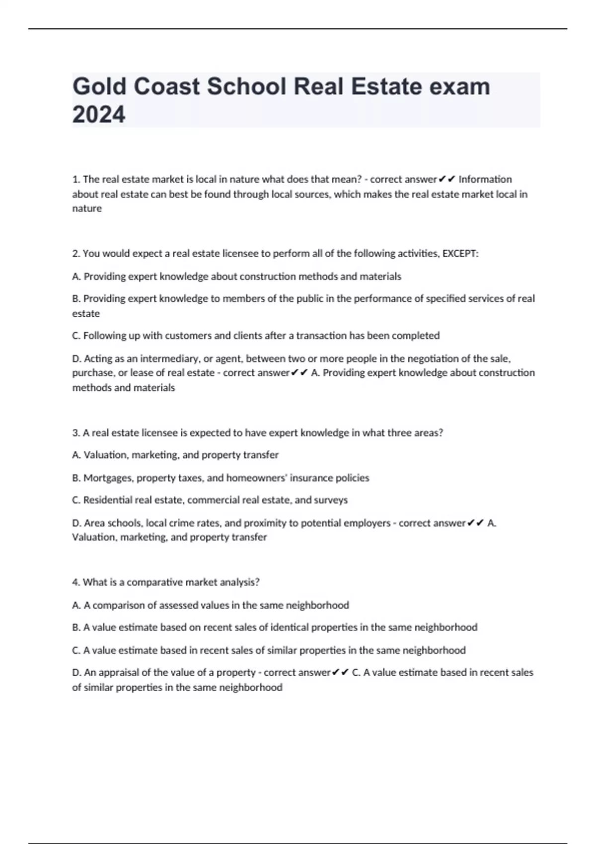 1. The real estate market is local in nature what does that mean? - correct answer Information about real estate can best be found through local sources, which makes the real estate market local in nature 2. You would expect a real estate licensee to perform all of the following activities, EXCEPT: A. Providing expert knowledge about construction methods and materials B. Providing expert knowledge to members of the public in the performance of specified services of real estate C. Following up with customers and clients after a transaction has been completed D. Acting as an intermediary, or agent, between two or more people in the negotiation of the sale, purchase, or lease of real estate - correct answer A. Providing expert knowledge about construction methods and materials 3. A real estate licensee is expected to have expert knowledge in what three areas? A. Valuation, marketing, and property transfer B. Mortgages, property taxes, and homeowners' insurance policies C. Residential real estate, commercial real estate, and surveys D. Area schools, local crime rates, and proximity to potential employers - correct answer A. Valuation, marketing, and property transfer 4. What is a comparative market analysis? A. A comparison of assessed values in the same neighborhood B. A value estimate based on recent sales of identical properties in the same neighborhood C. A value estimate based in recent sales of similar properties in the same neighborhood D. An appraisal of the value of a property - correct answer C. A value estimate based in recent sales of similar properties in the same neighborhood