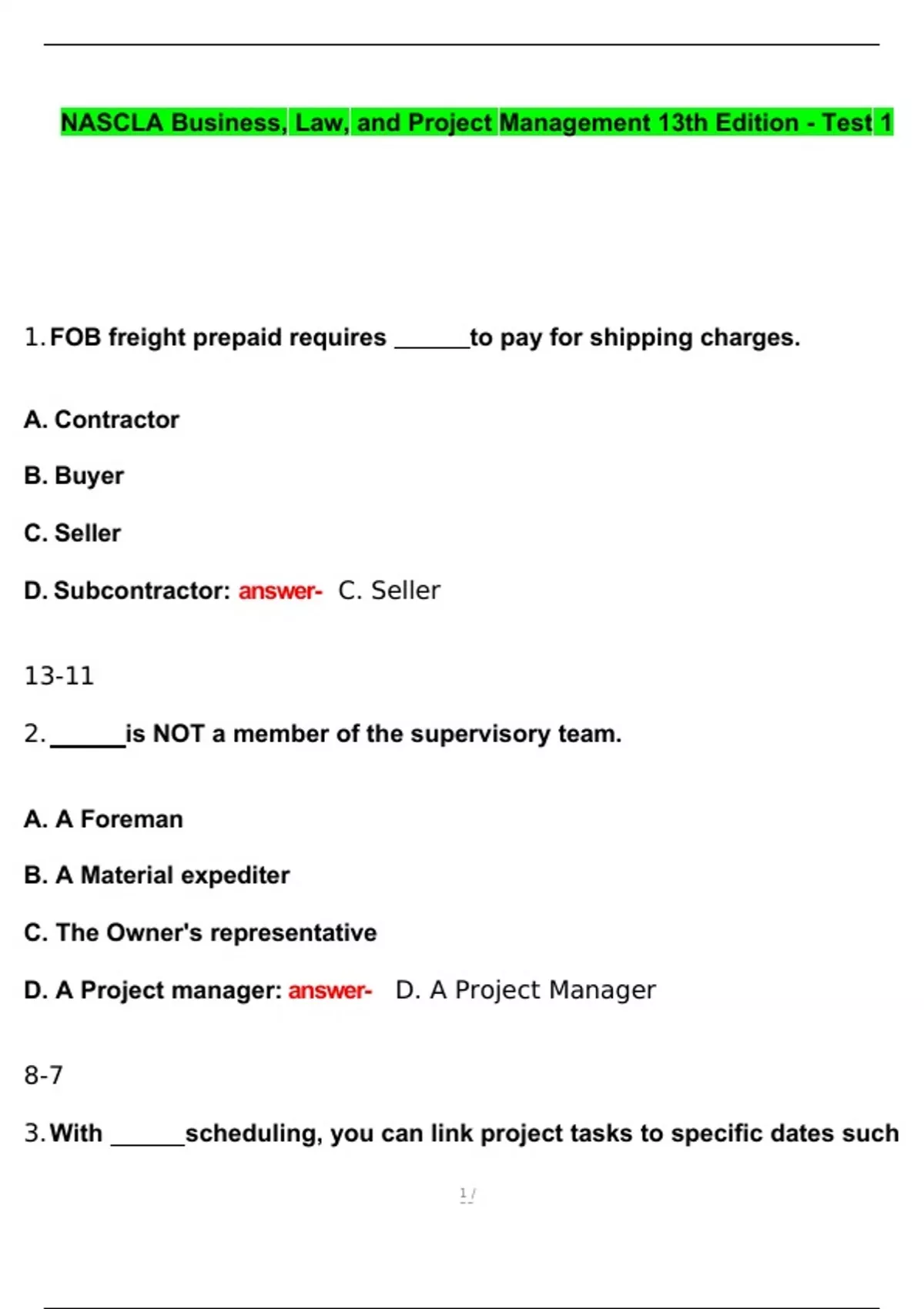 NASCLA Business, Law, and Project Management 13th Edition - Test 1 Exam Questions with Correct Answers FOB freight prepaid requires _____ to pay for shipping charges. A. Contractor B. Buyer C. Seller D. Subcontractor - answerC. Seller 13-11 _____ is NOT a member of the supervisory team. A. A Foreman B. A Material expediter C. The Owner's representative D. A Project manager - answerD. A Project Manager 8-7 With _____ scheduling, you can link project tasks to specific dates such as delivery dates, payment schedule and employee vacations and holidays. A. Calendar B. Bar Chart C. Gantt D. Critical Path Method - answerA. Calendar 8-3 When working in dwelling that was built prior to 1978, the employer is to provide each occupant with a pamphlet titled _____. A. Protect your family from lead in your home B. Protect you loved ones from lead in your home C. Protect your family and your friends from lead in your home D. Pamphlets are not required - answerA. Protect your family from lead in your home 11-13 Employers that violate child labor laws are subject to civil penalty of up to _____ per worker for each violation. A. $2,500 B. $5,000 C. $10,000 D. $11,000 - answerD. $11,000 10-3 A lump sum contract on a project has a total contract price of $260,000. Retainage has been held back at 10%. The contractor has received progress payments for 75% of the project. The contractor submits a request for final payment for _____. A. More than $80,000 B. Less than $50,000 C. Between $50,001 and $60,000 D. Between $60,001 and $70,000 - answerA. More than $80,000 7-3 and 13-9 $260,000x0.10 (10% retainage) = $26,000 held back in retainage $260,000 - $26,000 = $234,000 due in progress payments $234,000 x .75 (75% received) = $175,000 received in progress payments $260,000 - $175,000 = $84,500 final payment _____ is NOT a key characteristic of a sole proprietorship. A. The termination at death of the owner B. Business expenses and personal income are not separated C. The net income is taxed as ordinary income D. The owner/owners must bear all responsibility - answerB. Business expenses and personal income are not separated 2-1 The quick ratio (or acid test ratio) for a company that has current assets of $28,000, and inventory or $4,000, and current liabilities of $6,000 is _____. A. 4/1 B. 1/4 C. 7/1 D. 1/7 - answerA. 4/1 13-6 An Emergency Action Plan is required to be in writing if any employer has _____ employees or more.