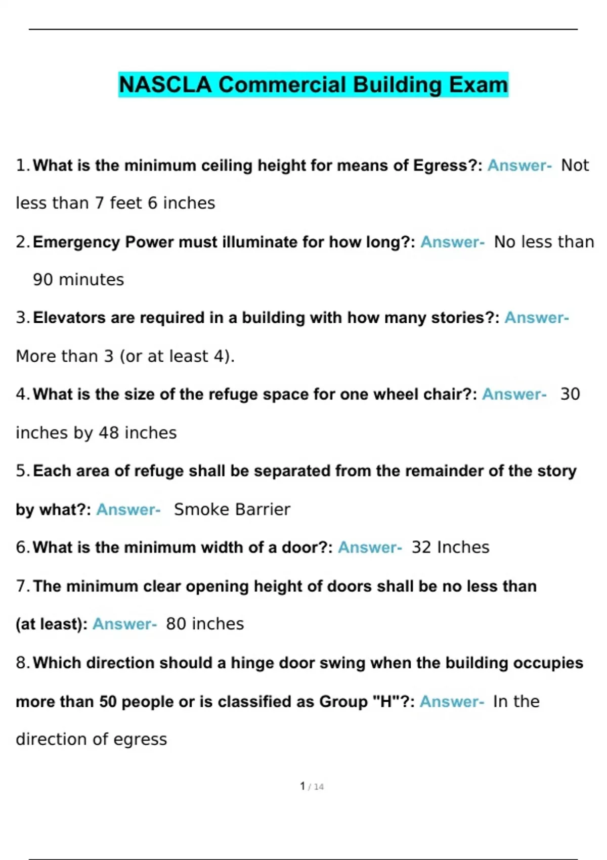 NASCLA Commercial Building Exam Questions With 100% Correct Answers What is the minimum ceiling height for means of Egress? - answerNot less than 7 feet 6 inches Emergency Power must illuminate for how long? - answerNo less than 90 minutes Elevators are required in a building with how many stories? - answerMore than 3 (or at least 4). What is the size of the refuge space for one wheel chair? - answer30 inches by 48 inches Each area of refuge shall be separated from the remainder of the story by what? - answerSmoke Barrier What is the minimum width of a door? - answer32 Inches The minimum clear opening height of doors shall be no less than (at least) - answer80 inches Which direction should a hinge door swing when the building occupies more than 50 people or is classified as Group