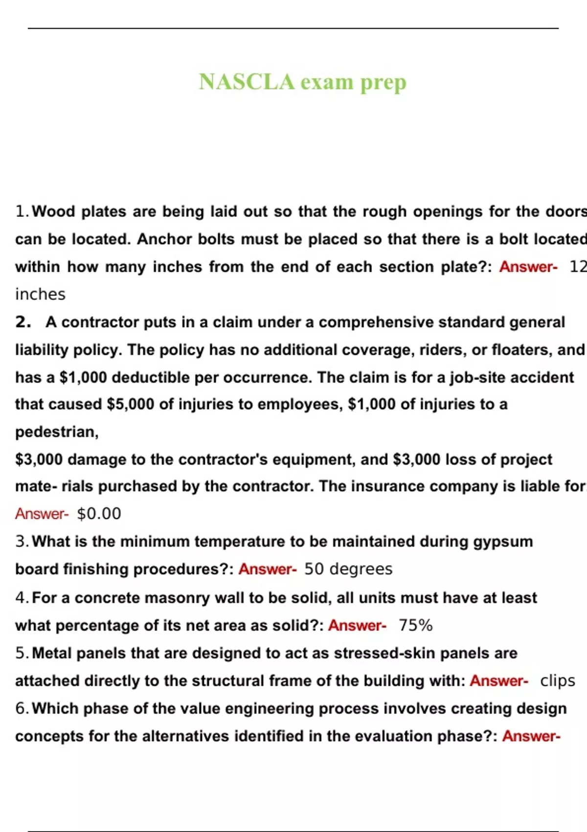 NASCLA exam prep Questions With 100% Correct Answers Accessible ramps should have a landing of at least how many inches? - answer60" Operable parts of equipment shall not require more than how many pounds pressure? - answer5 pounds The clear width of an accessible route must be how many inches? - answer36