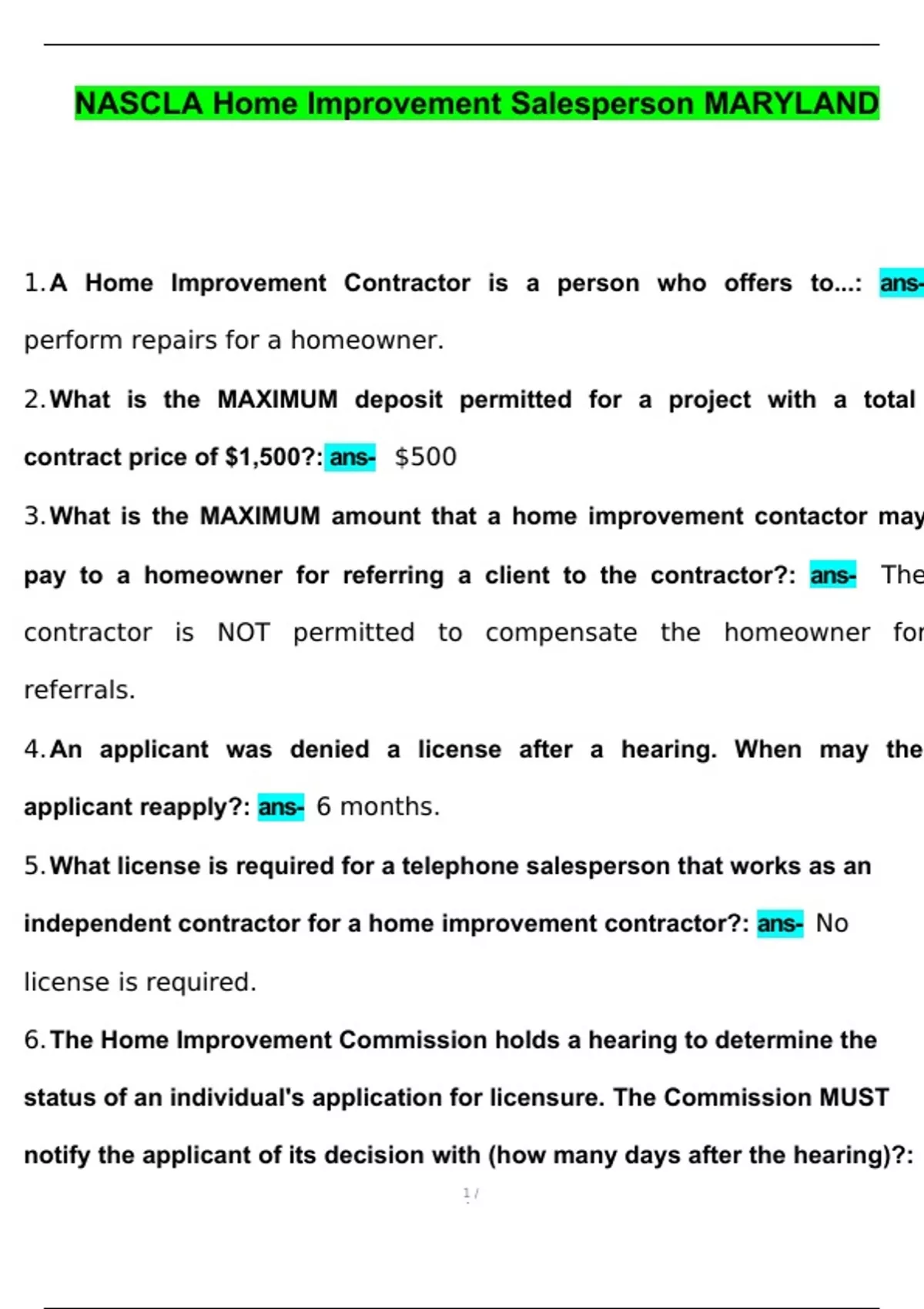 NASCLA Home Improvement Salesperson MARYLAND Exam Questions with Correct Answers A Home Improvement Contractor is a person who offers to... - answerperform repairs for a homeowner. What is the MAXIMUM deposit permitted for a project with a total contract price of $1,500? - answer$500 What is the MAXIMUM amount that a home improvement contactor may pay to a homeowner for referring a client to the contractor? - answerThe contractor is NOT permitted to compensate the homeowner for referrals. An applicant was denied a license after a hearing. When may the applicant reapply? - answer6 months. What license is required for a telephone salesperson that works as an independent contractor for a home improvement contractor? - answerNo license is required. The Home Improvement Commission holds a hearing to determine the status of an individual's application for licensure. The Commission MUST notify the applicant of its decision with (how many days after the hearing)? - answer60 days.