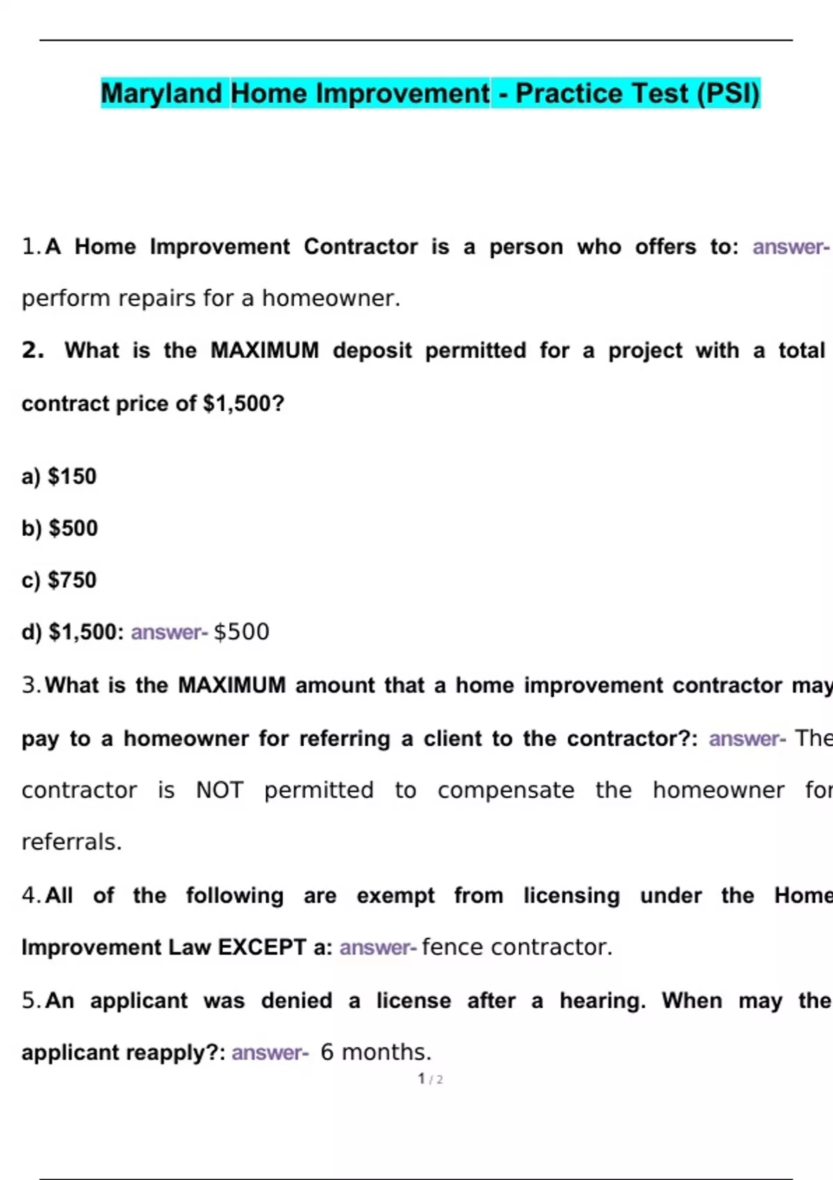 NASCLA PSI Contractors Exam MD Questions With 100% Correct Answers Home Improvement Law in contained in Title 8 - answerof the Annotated Code of MD in 8 sections The Home Improvement Law is passed and amended by the.. - answerGeneral Assembly and signed into Law by the Governor The Commission's regulations are published in the.. - answerCOMAR: Code of Maryland Regulations Important roles of the Commissioners: - answerpromulgate regulations in order to help judges, attorneys, licensees, and homeowners better understand the requirements of Home Improvement Law What is Home Improvement? - answerThe addition or alteration, conversion, improvement or remodeling or repair or replacement of a building or part of a building that is used or was designed to be used as a residence or dwelling place or a structure adjacent to that building or an improvement to land adjacent to the building. Home Improvement is a broad term - answerand does not only include work done to the structure of a home. A contractor is... - answera person who performs or offers or agrees to perform a home improvement for an owner A subcontractor is... - answerenters into contracts with contractors or other subcontractors to perform all or part of a home improvement. A subcontractor is not authorized to enter into agreements directly with homeowners. A subcontractor doesn't include a laborer or supplier of materials. A home improvement contract is... - answeran agreement between a homeowner and a contractor to perform a home improvement. Contracts must be - answerin writing and signed by the parties to the agreement To sell a home improvement means... - answerto negotiate or offer to negotiate a home improvement contract with an owner, or to seek to get an owner to enter into a contract A license is issued to... - answera contractor or salesperson only issued by the Home Improvement Commission Does a Handyman need a license? - answerYes. no matter how small the contract, if the work is a home improvement, then yes. Does Home Improvement law apply to parties of government agencies? - answerNo. Section 8:102 The commission was established in... - answer1962 How many commissioners are appointed by the governor? - answer9 ------ commissioners must have experience in the business of home improvement. - answer4 ----commissioners must represent the consumers/general public - answer4 4 commissioners have business experience, 4 represent the public consumer, and 1 must have - ------ experience - answerbanking or financing The Governor appoints the Chairperson from the 9 members. T or F - answerTrue How often to the commissioners hold business meetings/hearings? - answerbimonthly Commissioners must have resided in MD for how many years? - answer5 Commissioners serve a ---- year term - answer4 (just like the president) A quorum is a majority of the authorized membership. A quorum for the 9 member commission is ---- - answer4. why not 5? idk, says 4 on page 1-4 T or F? All final violation actions taken by the Commission may be part of a contractors complaint and license history? - answerTrue Every ---- years the licensee must apply to renew their license - answer2 .....two...... 2 A licensed contractor IS permitted to act as a salesperson, but - answera salesperson is not a contractor Each contractor is required to maintain general liability insurance in the amount of at least... - answer$50,000 smackers The Home Improvement Guaranty Fund does what? - answercompensates homeowners for the actual loss caused by the acts or omissions (incomplete, incorrect, or unworkmanlike job) of a licensed contractor